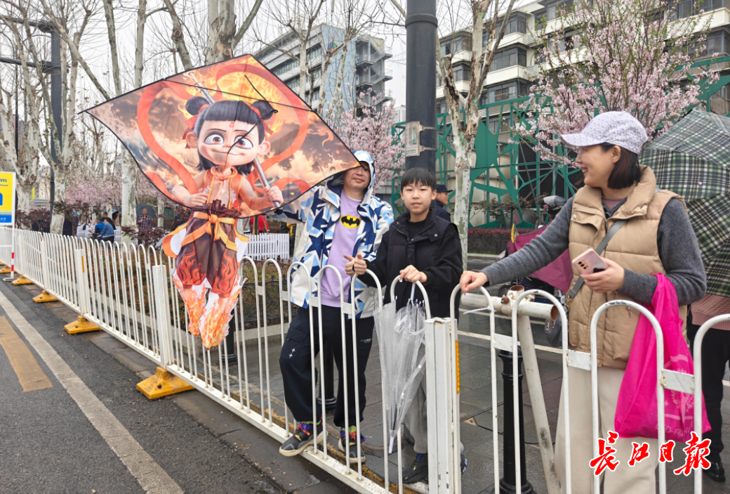 市民在樱花树下带着“哪吒”风筝为跑者加油助威。记者商佩 摄