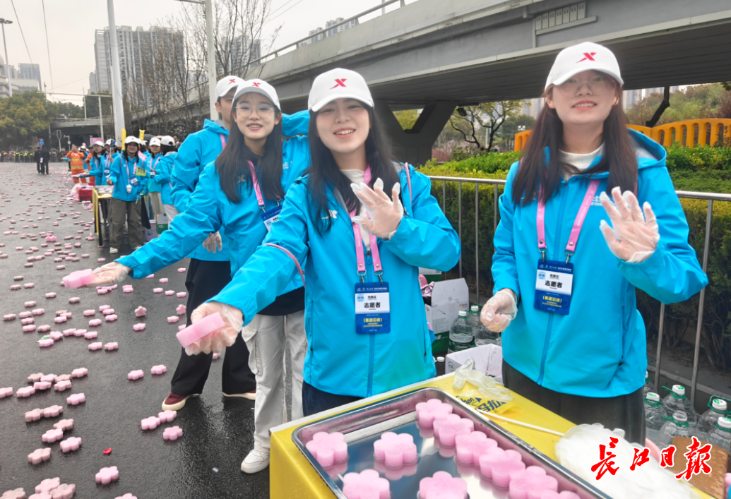 青春热血在雨中沸腾,成为赛道上的一抹亮色。武汉城市职业学院的志愿者一边唱着《团结就是力量》一边给跑友递水。戴世豪同学说:“看到跑者竖起大拇指,手再酸也值了!”补给点旁,一位山东小伙凌晨五点就赶来当志愿者,他说:“武汉马拉松早有耳闻,今天终于能来亲自感受,太激动了!”