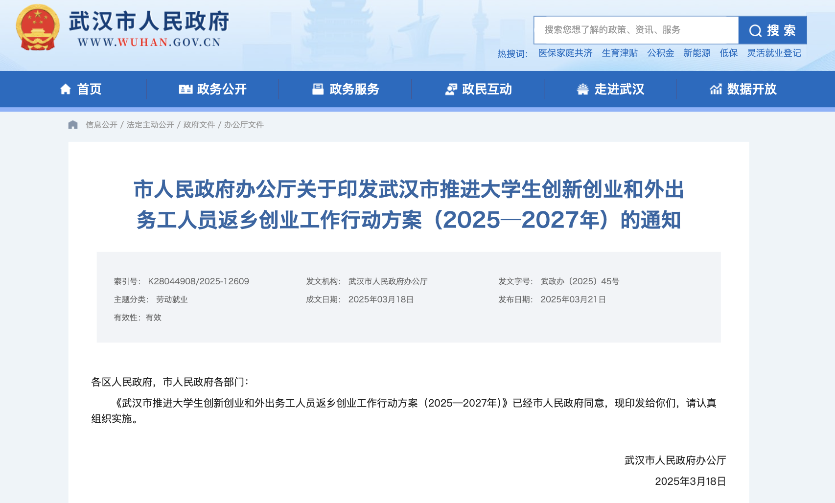 《武汉市推进大学生创新创业和外出务工人员返乡创业工作行动方案(2025—2027年)》已经市人民政府同意,现印发给你们,请认真组织实施。