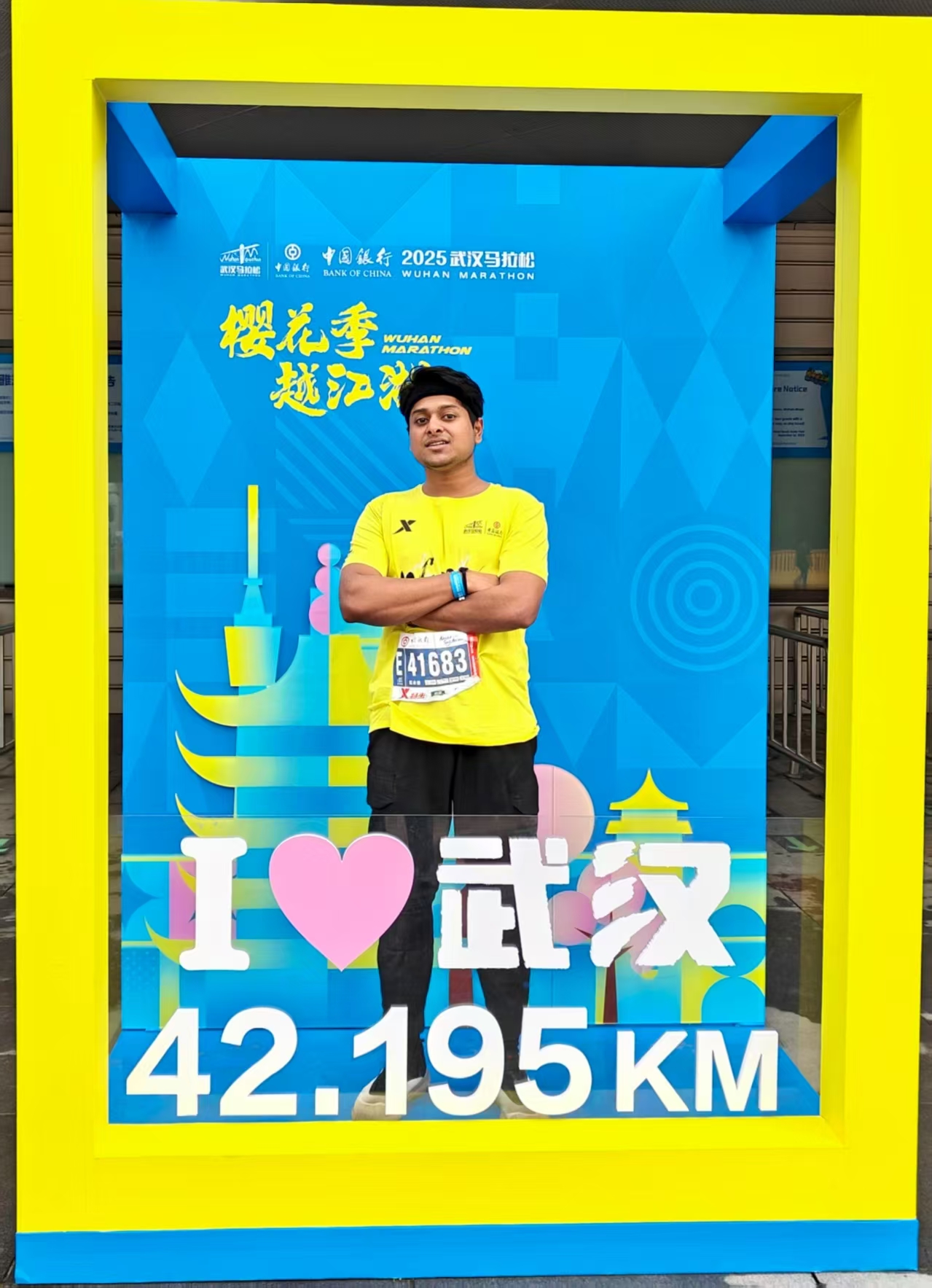 2020年,赵永德来到华中科技大学中欧清洁与可再生能源学院学习,研究方向是新能源。曾经是个运动达人的他,因为吃药及少运动而长胖了很多。去年本科毕业时,体重一度飙升至93公斤。后来接着在华中科技大学读研,看到2025武汉马拉松的宣传海报,就立刻报名了,“我始终有一颗热爱运动的心,希望能够在体育领域挑战自我,做出更多突破。”