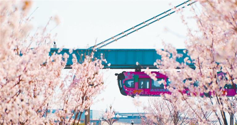 3月21日,穿上“樱花新装”的光谷空轨穿行在花海间。目前,武汉高新大道的2000余株樱花进入盛花期,形成一条壮观的“樱花长廊”,成为市民赏樱的热门打卡点。