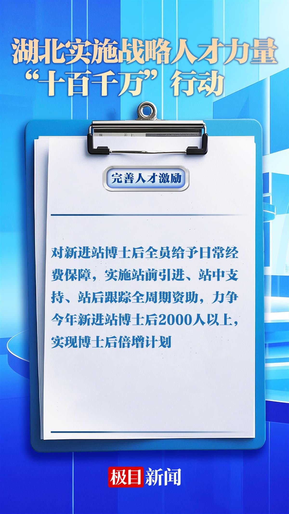 发布会上介绍,湖北将着力完善人才评价机制、人才激励机制、人才服务机制。其中,在人才激励方面,对新进站博士后全员给予日常经费保障,实施站前引进、站中支持、站后跟踪全周期资助,力争今年新进站博士后2000人以上,实现博士后倍增计划。