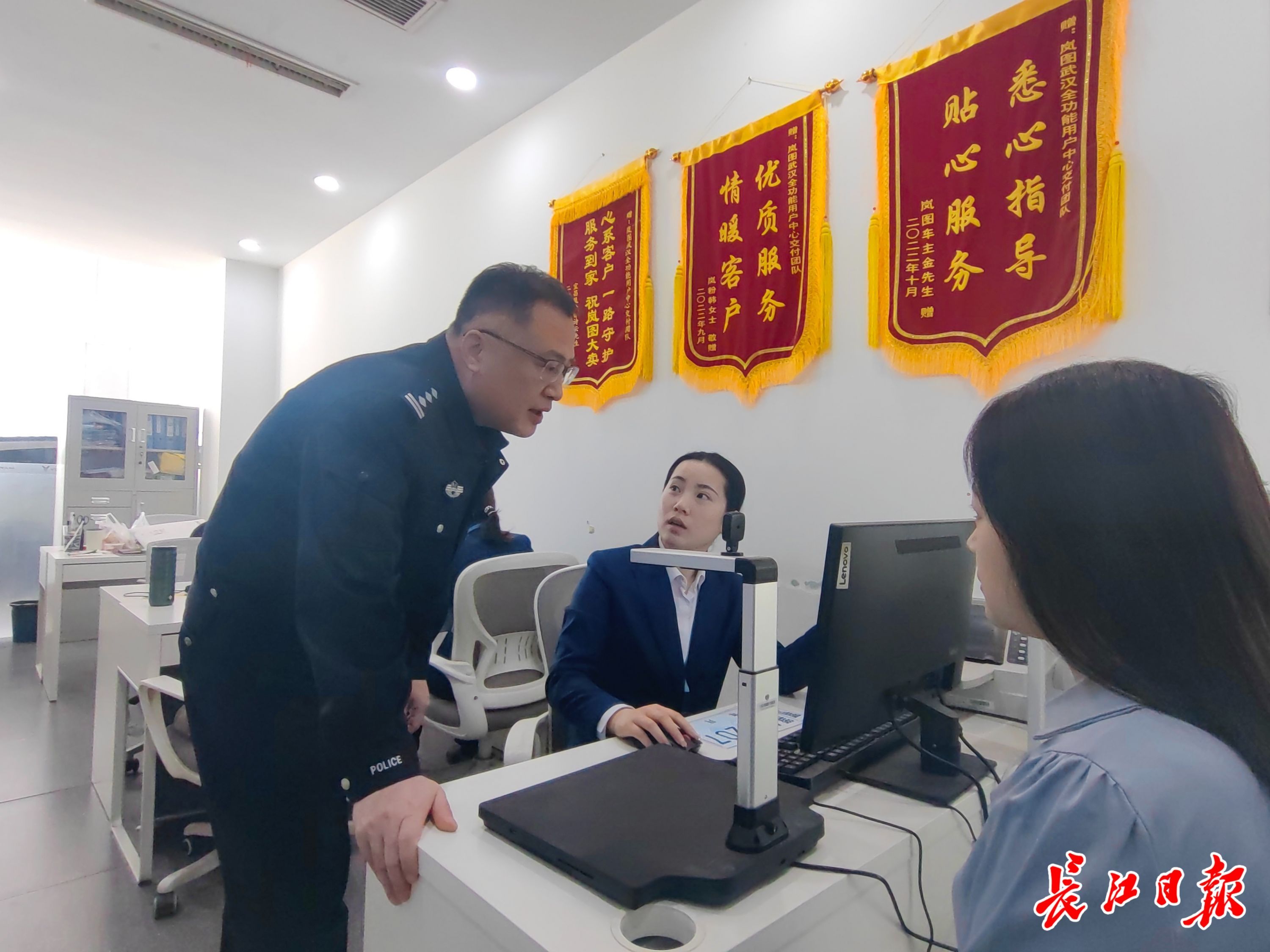 武汉市公安局交通管理局车辆管理处第六党支部党员黄端立手把手教4S店员工操作线上临牌办理系统。记者高萌摄