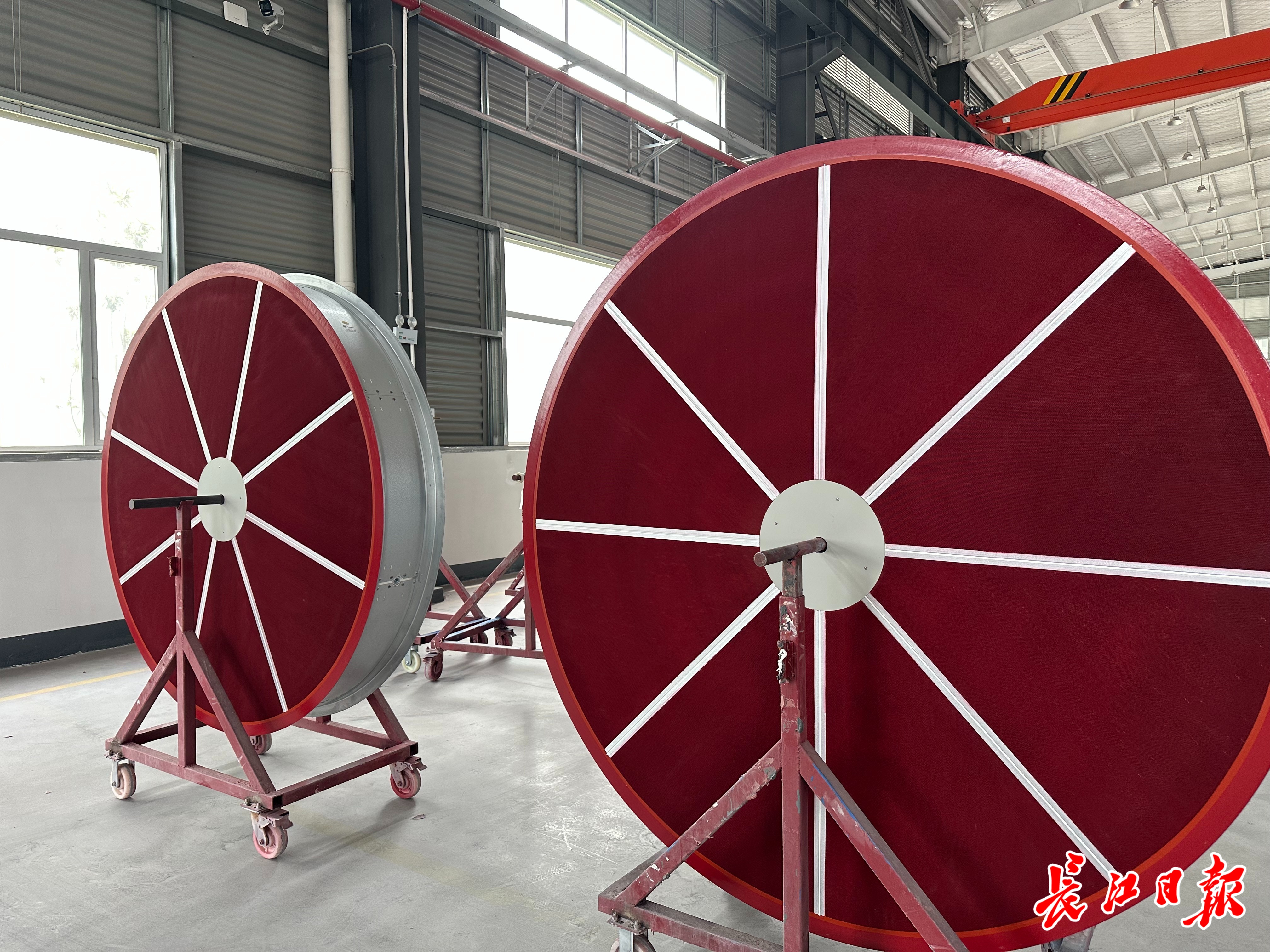 企业生产车间内,数个直径超过2米的圆柱形硅胶材质转轮固定在支撑架上。