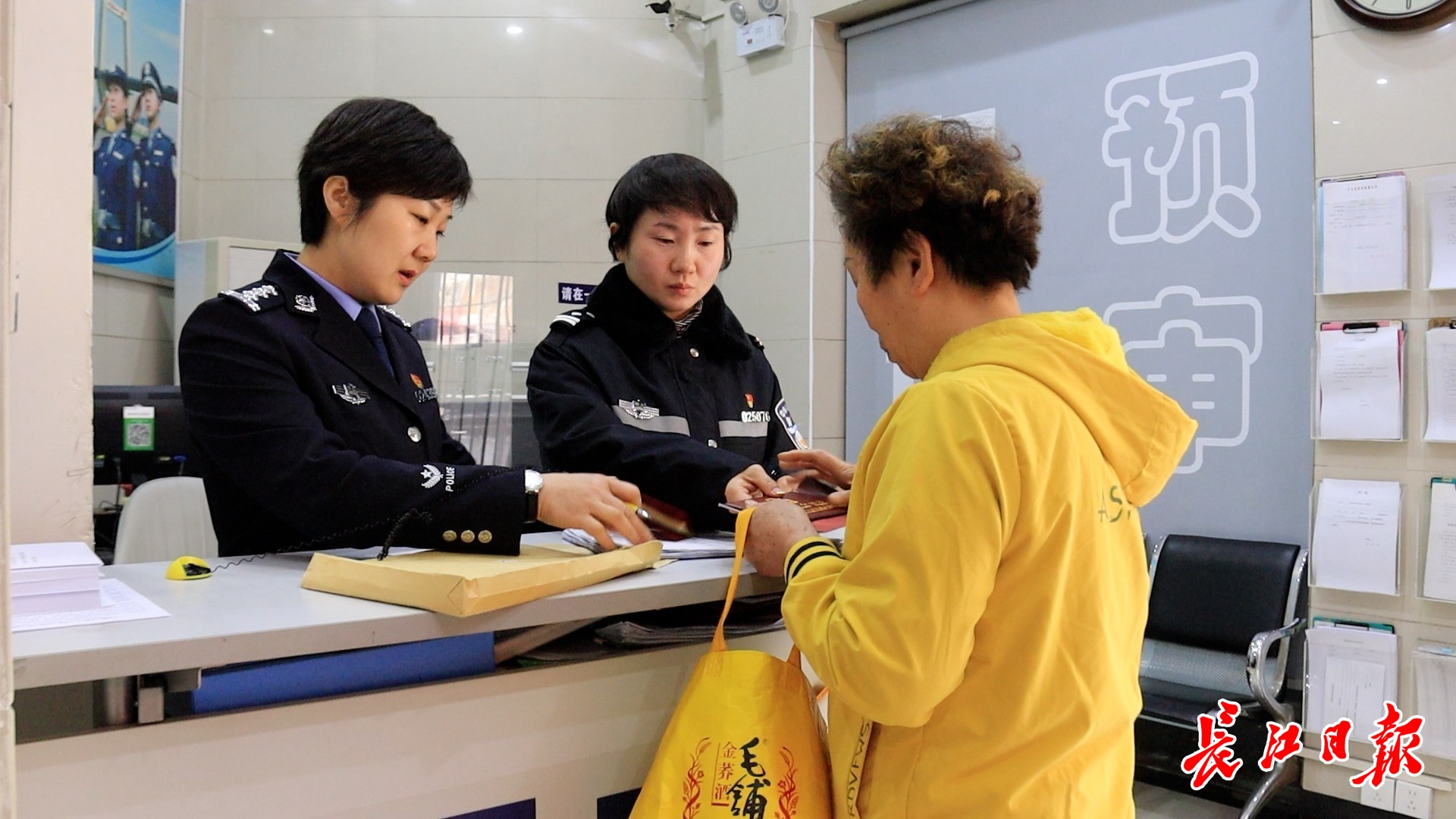 市民郑凤兰(右一)在江岸区户政服务中心办理户口迁移手续。