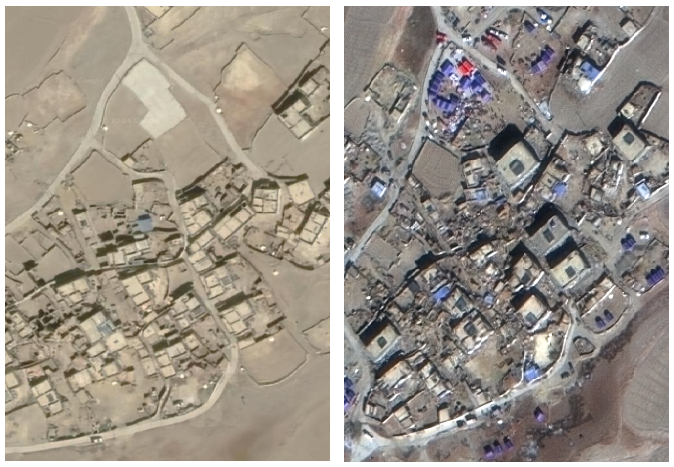 位于震中正南方1.5KM的定日县塘仁村,与灾前的卫星影像对比,可以看到应急帐篷,塘仁村中间有部分的建筑损毁。