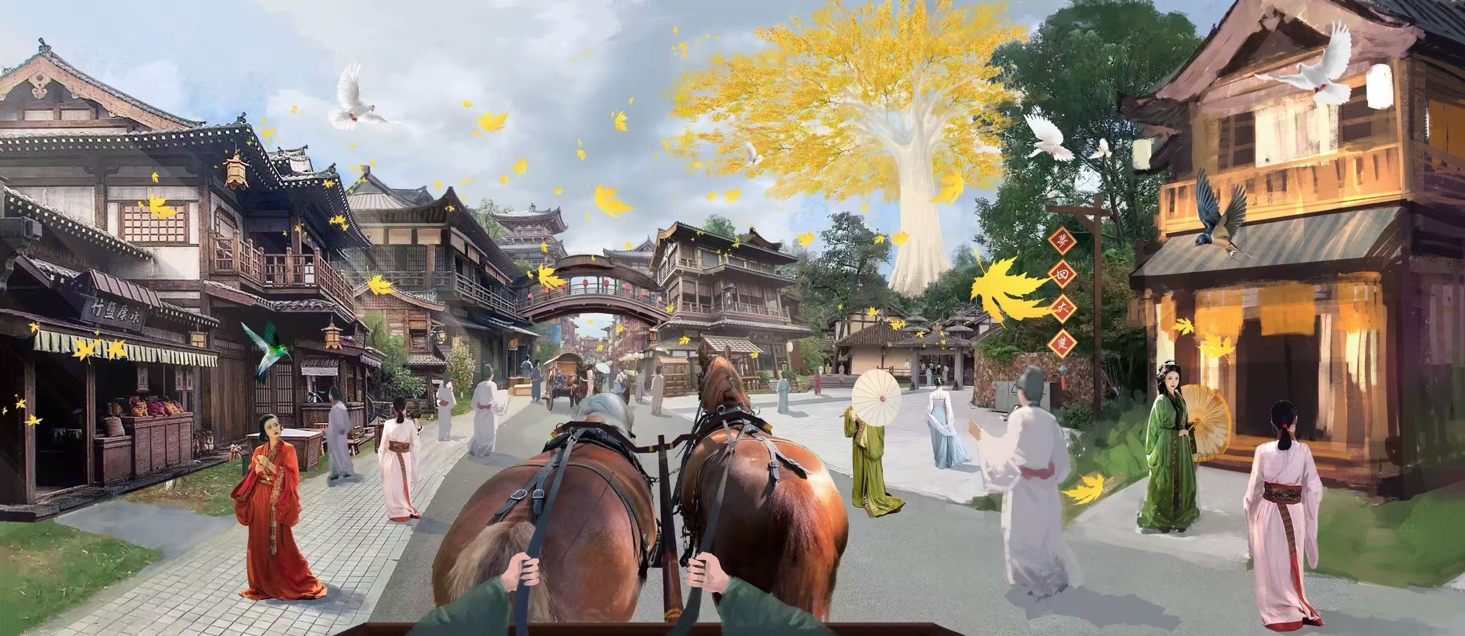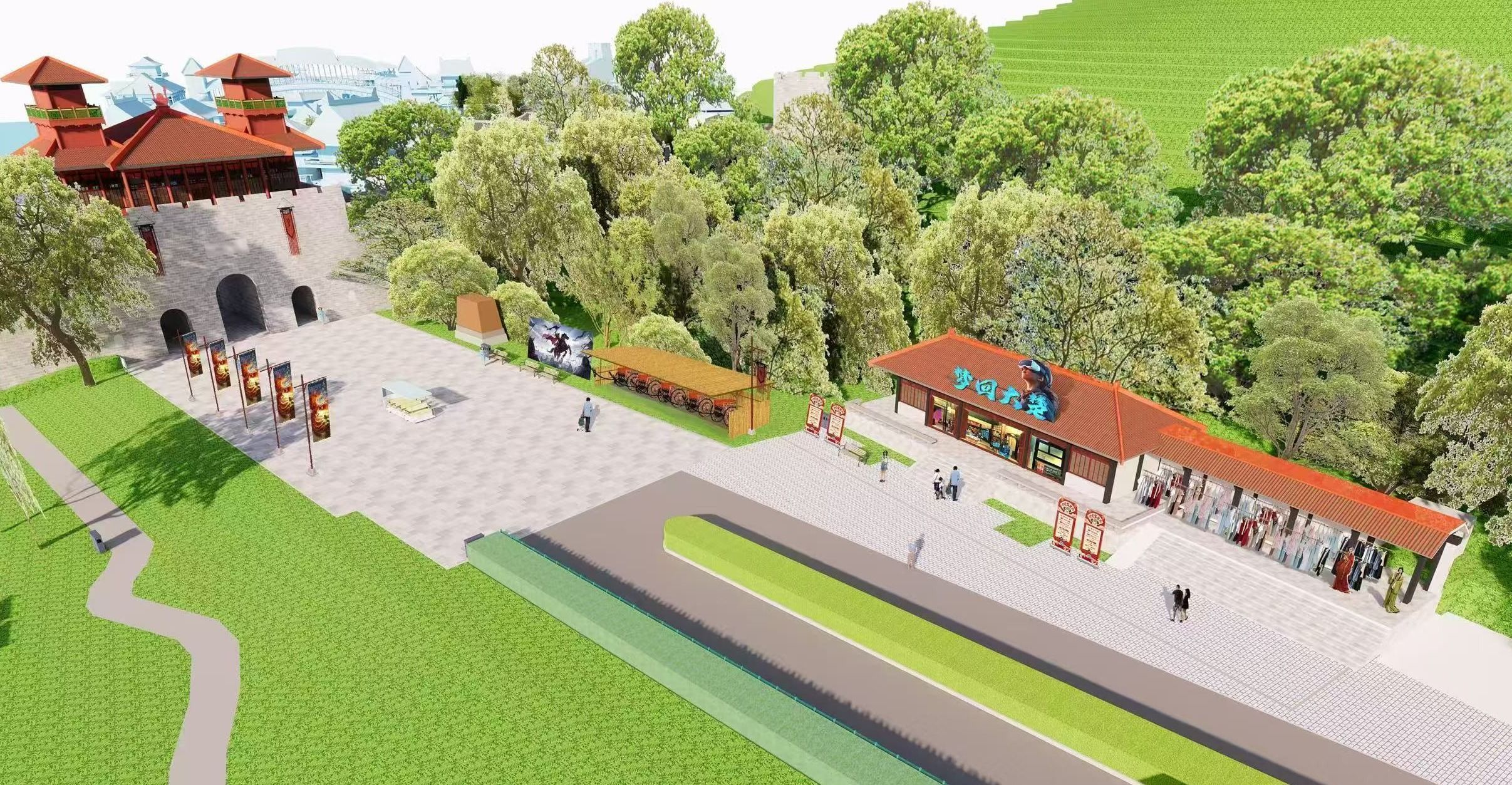 “梦回大楚”数字游艺综合体部分效果图,玩家戴上头显设备可穿越虚拟与实景相结合的“楚国”。
