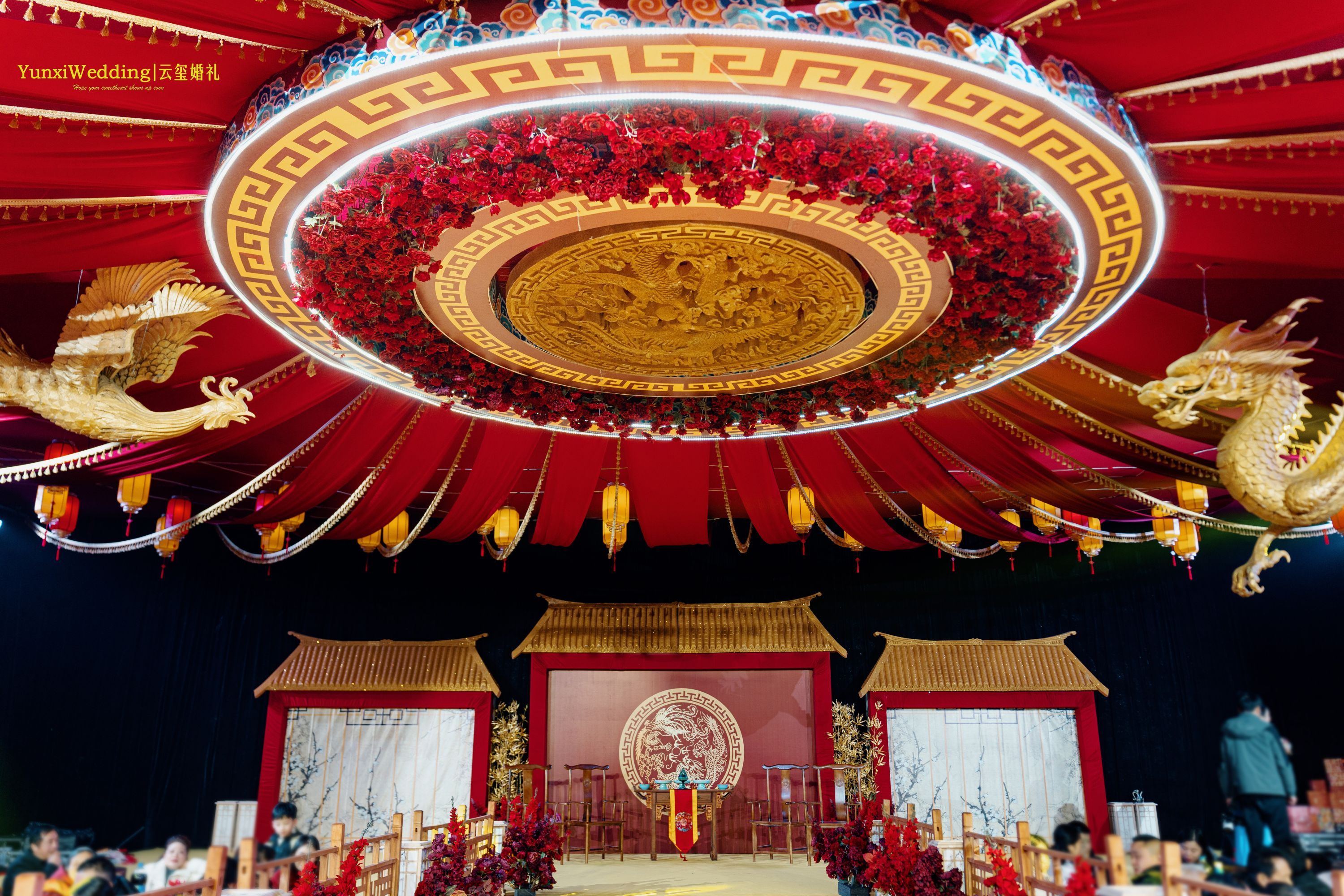 “大棚婚礼”打造出媲美酒店婚礼的灯光舞美效果,满足在乡间户外办婚礼人群的需求。