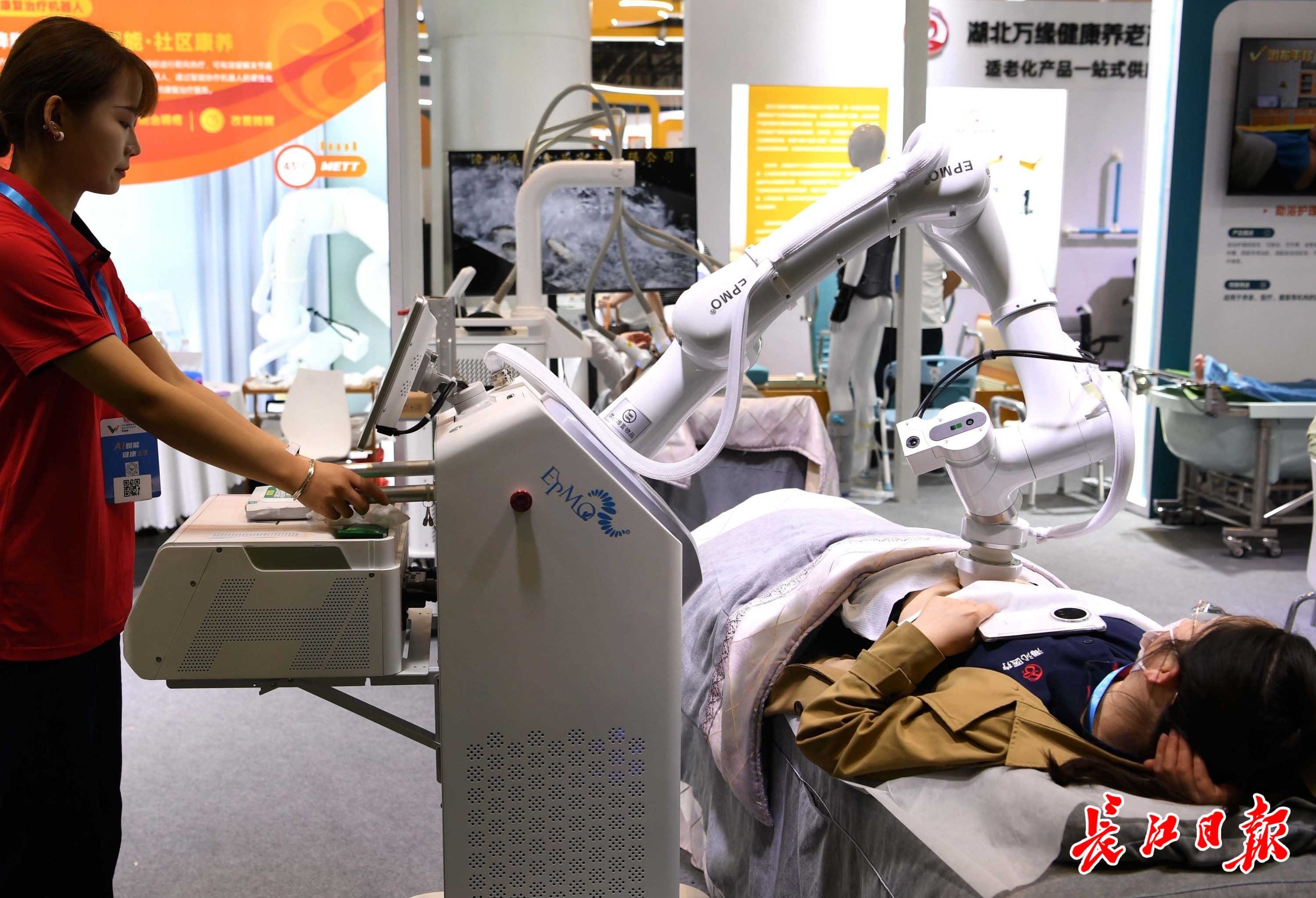 在武汉海沁医疗展厅,市民詹先生躺在床上,手臂前端由近10个探头组成“柔软手”的热疗康复机器人轻轻按压他的背部,一旁的大屏上实时显示按压力度和身体温度变化。