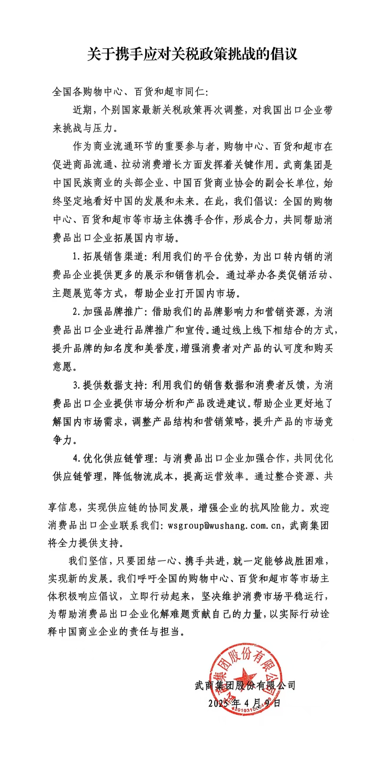 作为商业流通环节的重要参与者,购物中心、百货和超市在促进商品流通、拉动消费增长方面发挥着关键作用。武商集团是中国民族商业的头部企业、中国百货商业协会的副会长单位,始终坚定地看好中国的发展和未来。在此,我们倡议:全国的购物中心、百货和超市等市场主体携手合作,形成合力,共同帮助消费品出口企业拓展国内市场。