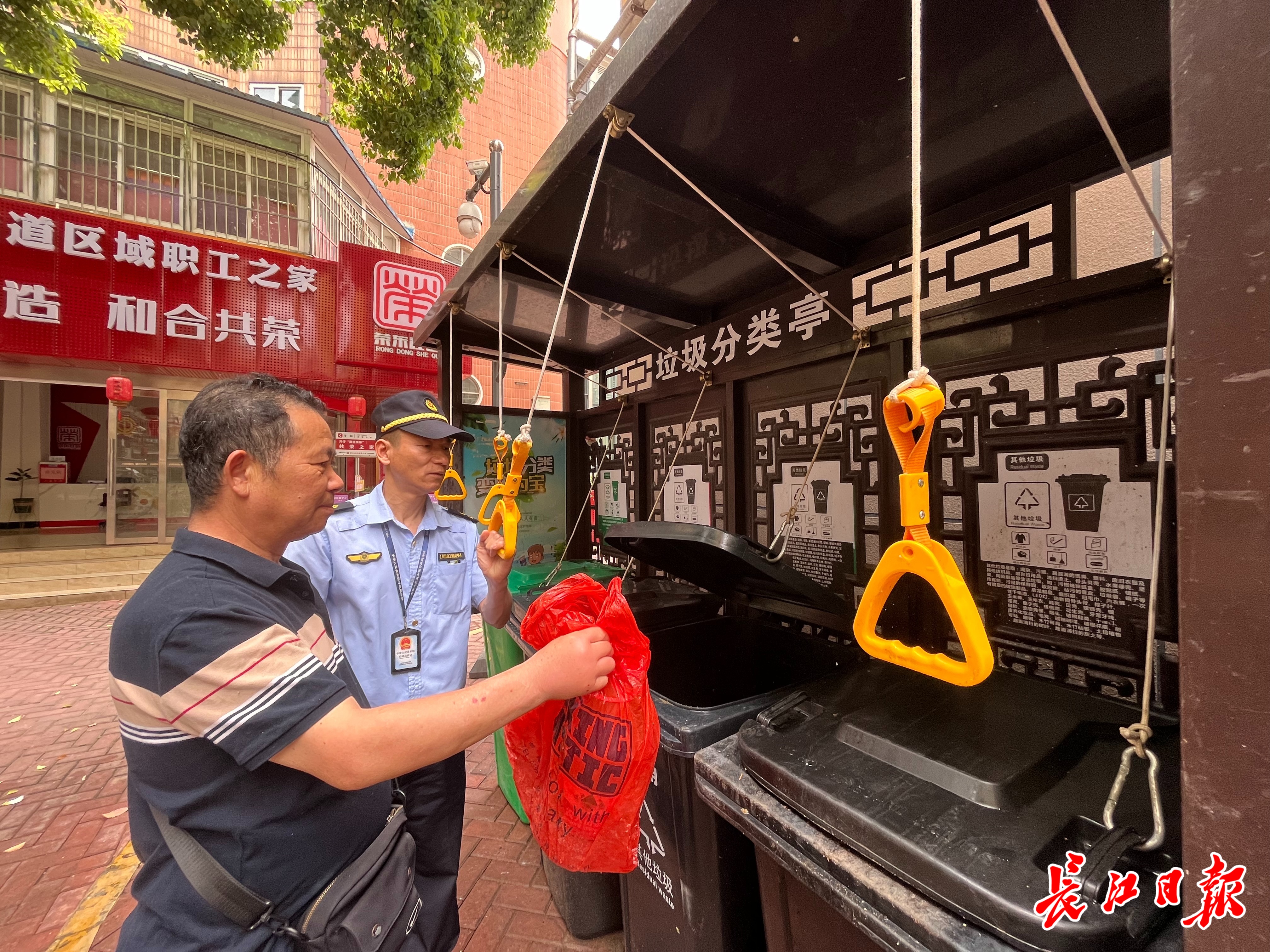 胡凯(右)引导居民使用吊环拉手开启垃圾桶。长江日报记者 宋磊 摄