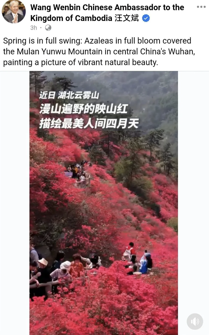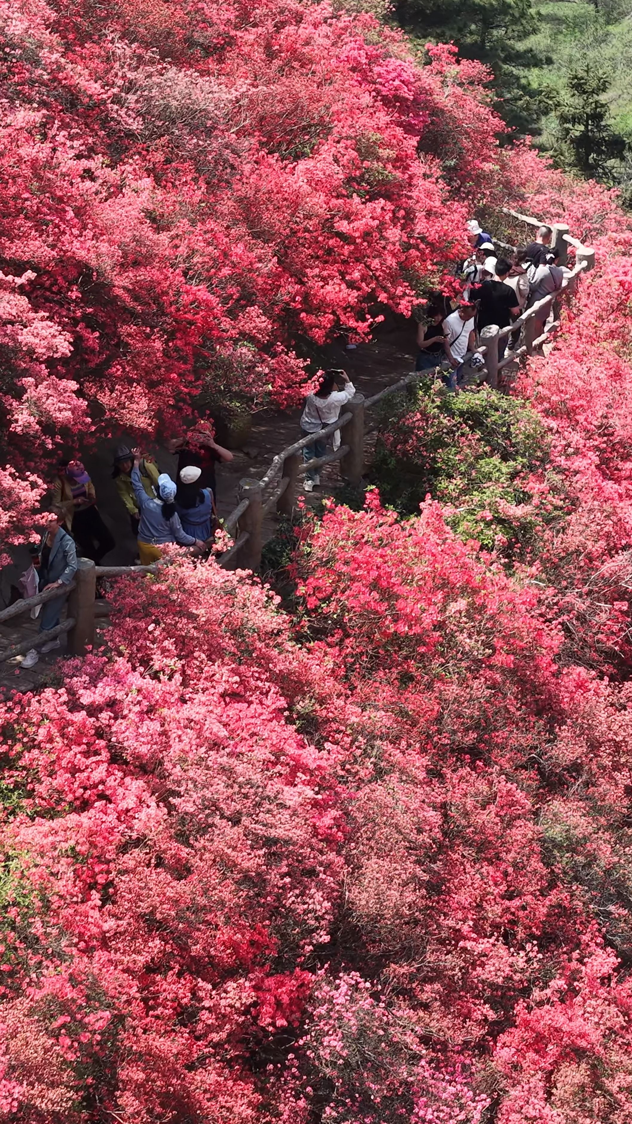 “岭上开遍哟,映山红……”四月的武汉黄陂木兰云雾山,万亩野生杜鹃花竞相绽放,绵延800米的赏花环线,绘就了“人在花中游”的春日画卷。4月10日,中国驻柬埔寨大使汪文斌在海外社交平台发帖点赞:“春意盎然,中国中部武汉市木兰云雾山漫山遍野的映山红,描绘了一幅充满活力的自然美景。”