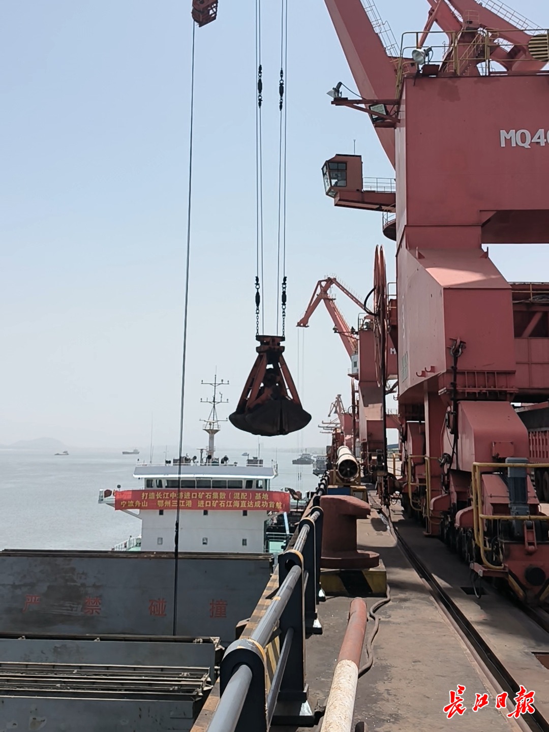 抓斗从“江海直达16”轮转运铁矿石。记者刘海锋摄