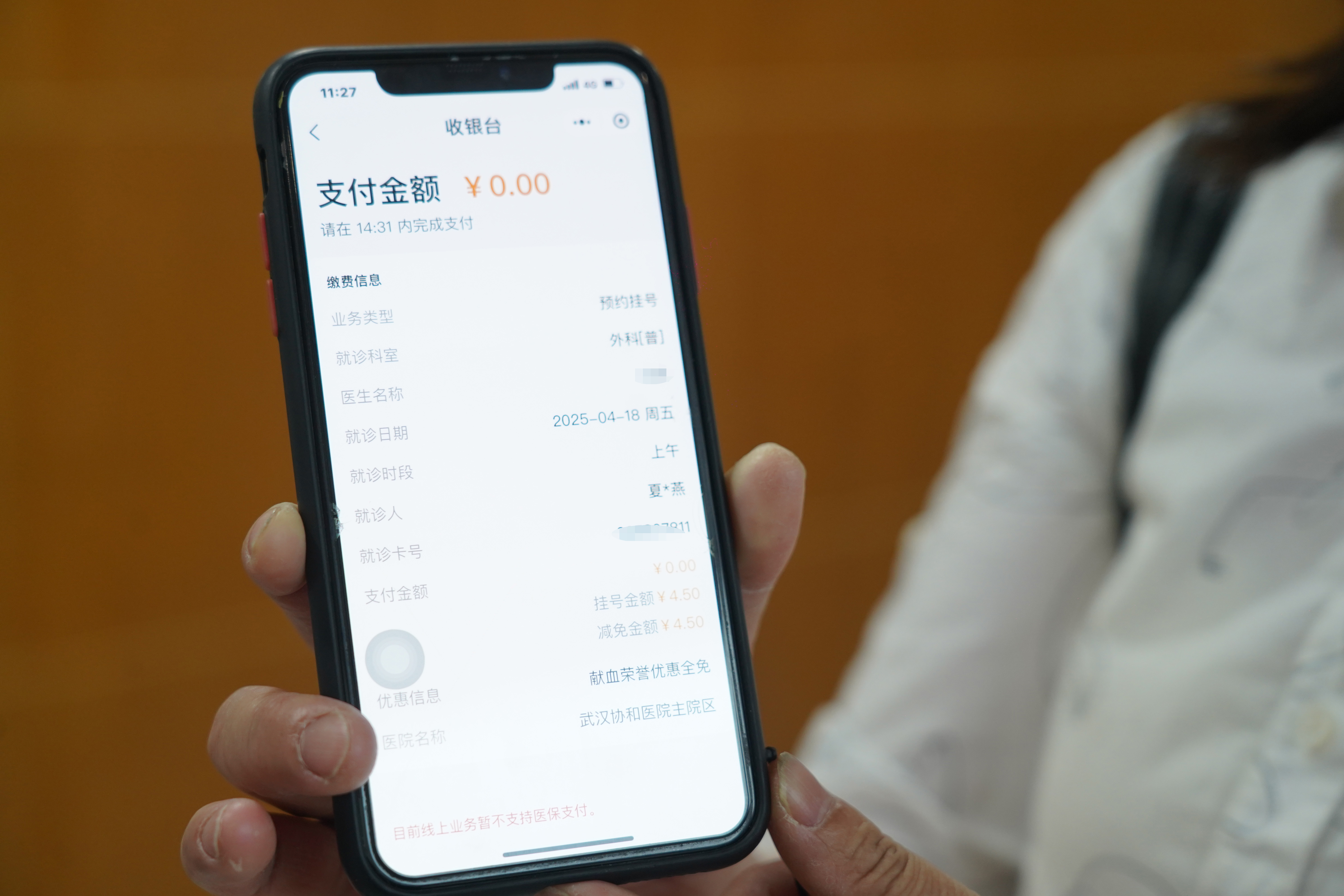 55岁的夏伟燕是“武汉市无偿献血荣誉卡”获得者,她迄今265次献血,累计献血总量达67100毫升。17日,她到协和医院挂普通号开药,不仅不用排队,窗口工作人员提醒她可免普通号挂号费。夏伟燕的预约挂号手机端显示,支付挂号金额为0,优惠信息一栏标注“献血荣誉优惠全免”。