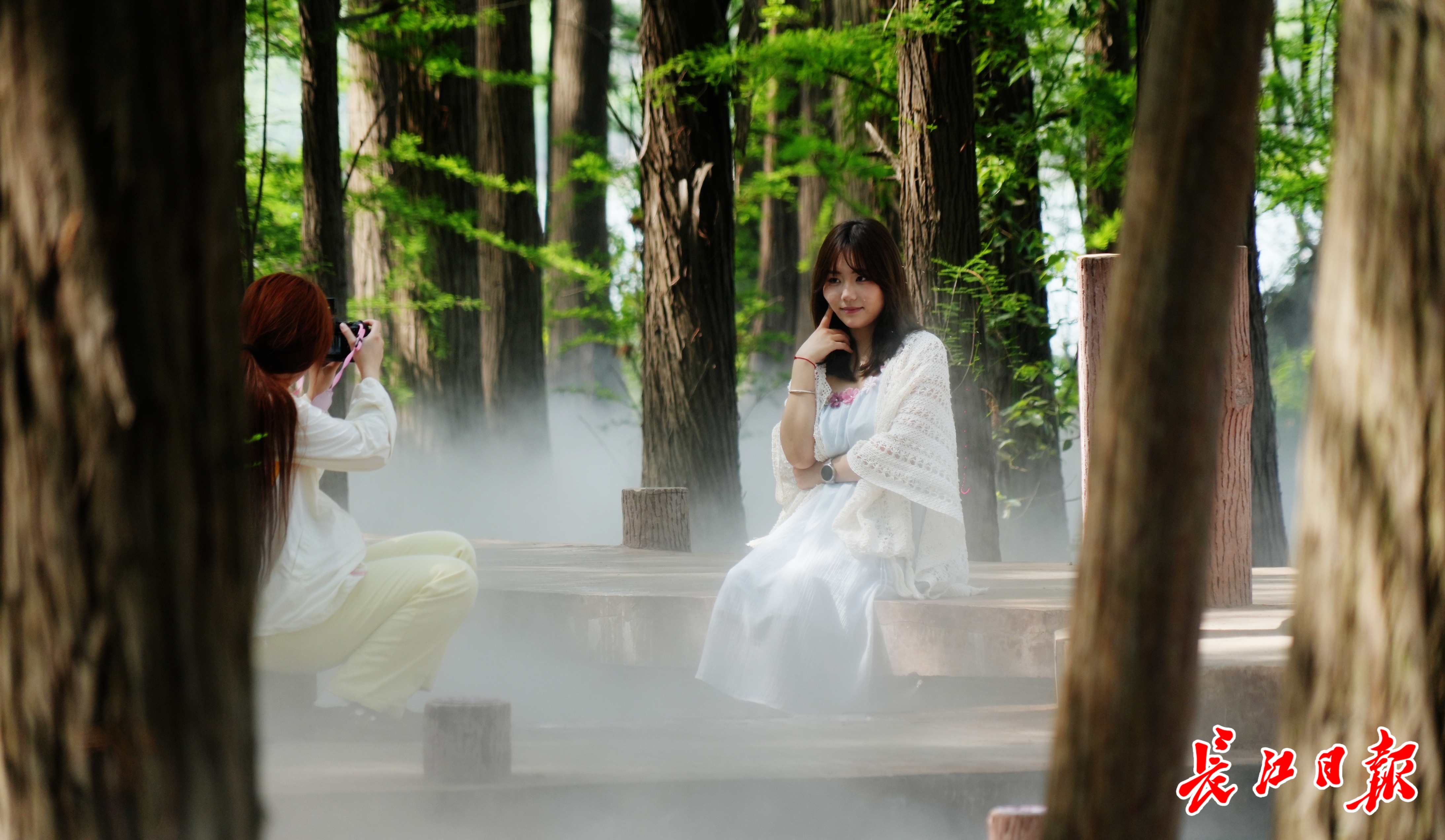 在藤本月季编织的粉色花墙下,来自湖南的游客周游正为女友拍摄写真:“我们专程坐高铁来打卡,这里的西式花亭像欧洲古典油画,中式建筑又充满江南韵味,一套照片能拍出两种文化风格。”周游对长江日报记者说,刚刚,他们还在园内多个地方拍摄出“人生照片”:“九曲桥的水杉和栈道太出片了,这种湿地景观很少见,雾气中真的就像仙境。我们还在湖边的石滩旁拍了很久,等会儿还准备去竹筏上拍几张!”