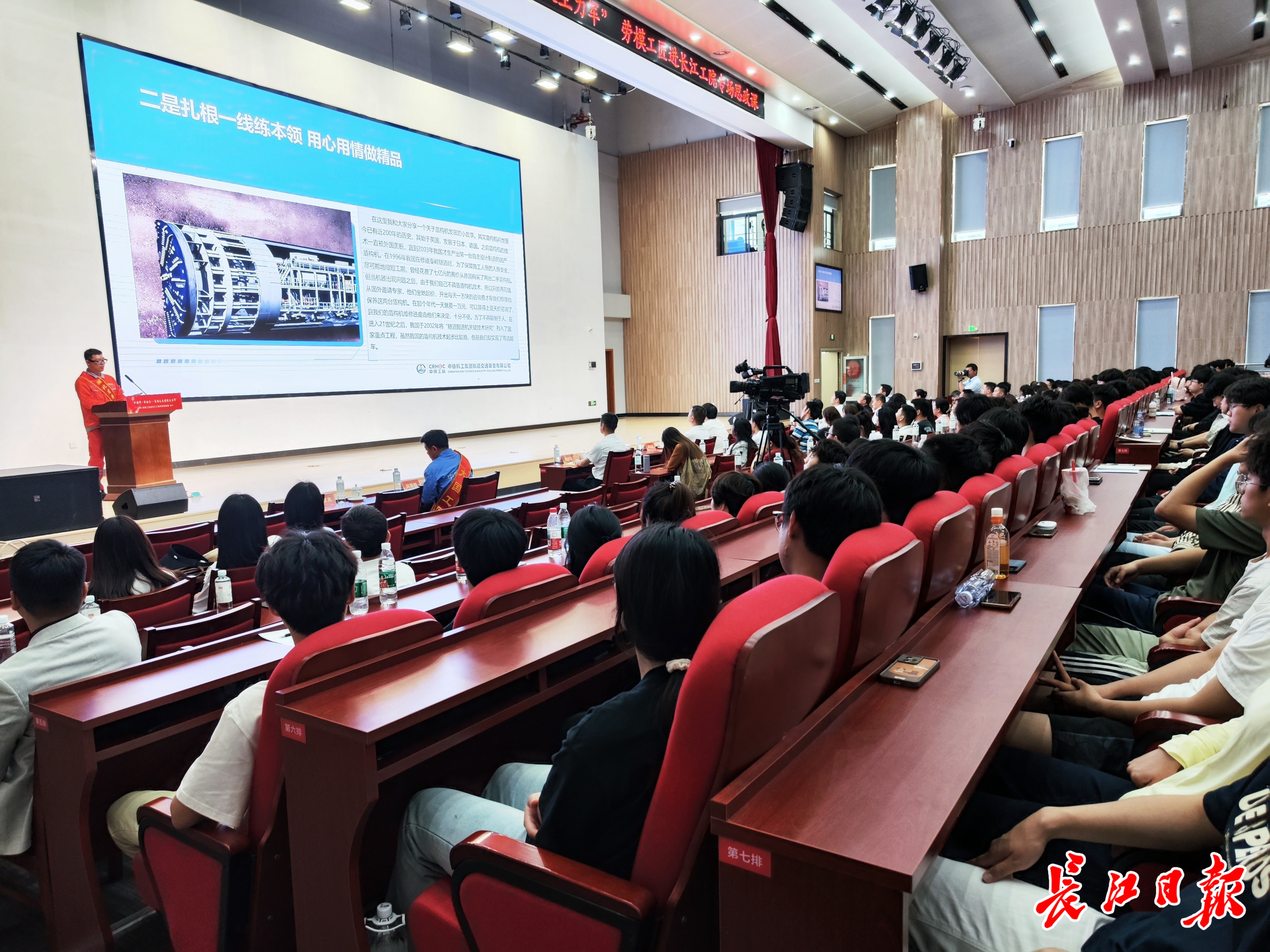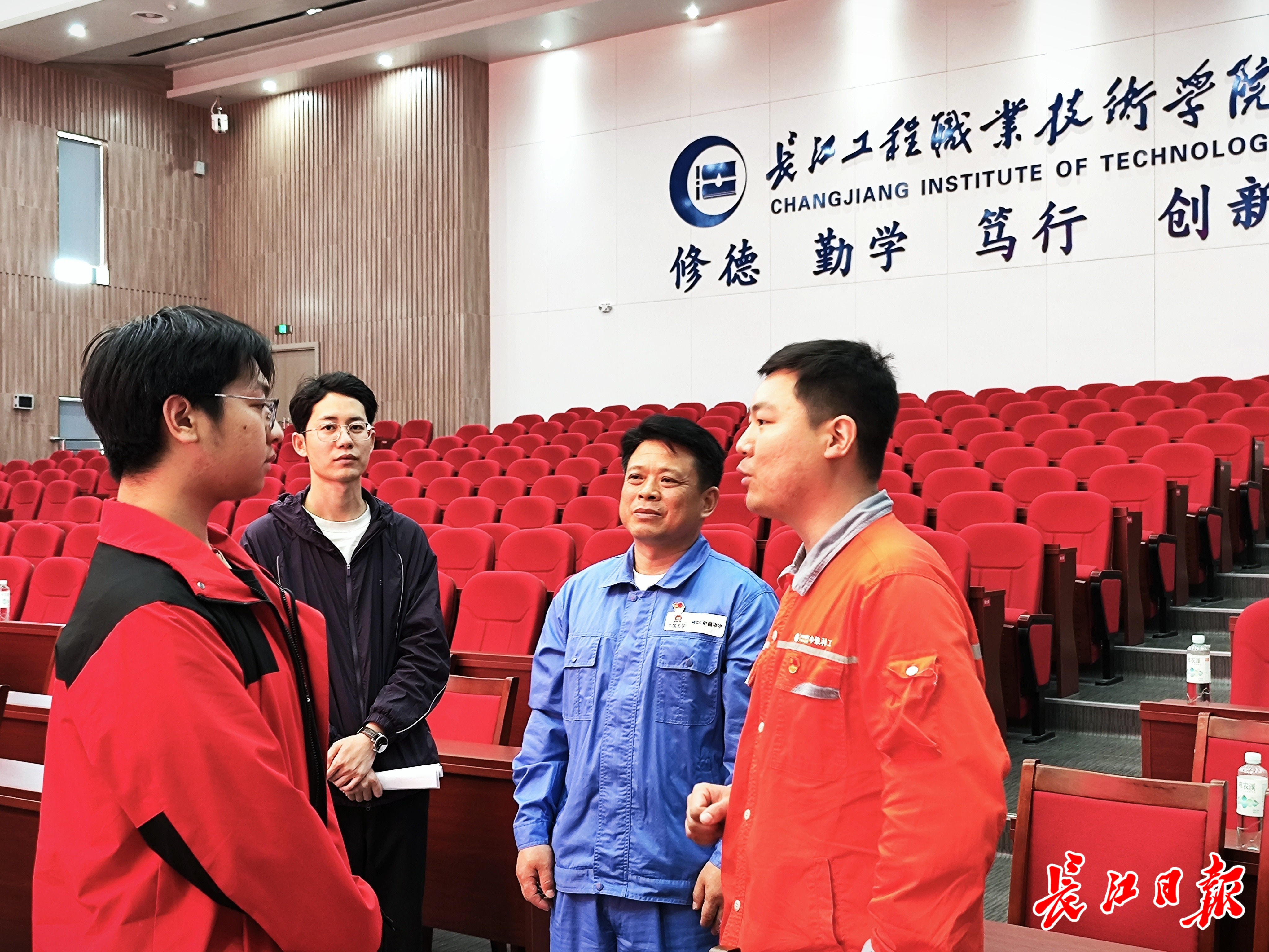 长江工程职业技术学院报告厅内掌声如潮。两位身着工装的技能大师稳步登台:身穿蓝色工装的是中国一冶砌筑工吴春桥,也是武汉市唯一一位大国工匠培育对象;身穿橙色工服的是湖北省劳模陈汉龙,他是中铁科工集团轨道交通装备有限公司重型装备厂机加车间班长。当主持人介绍他们获得的荣誉时,台下00后学子们眼中闪烁着憧憬和崇拜。