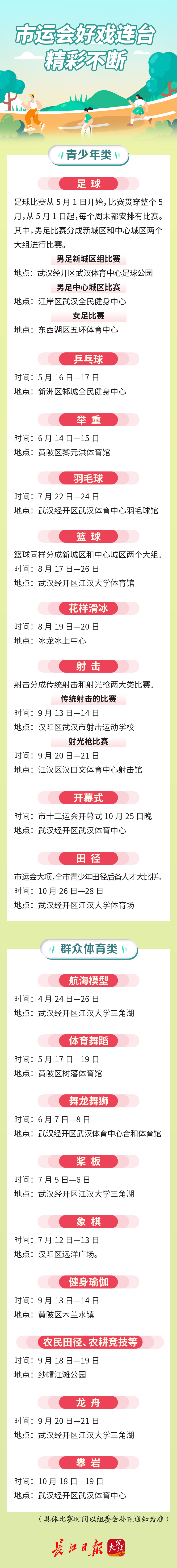 从4月19日开始,网球、乒乓球、羽毛球、棋类等项目比赛将陆续展开,各类比赛将一直持续到市运会闭幕,每月都有多项比赛。市运会比赛期间,全市各城区还将举办一系列“与市运同行”大型全民健身活动,预计将有近百万人参与到各项赛事及相关活动中。
