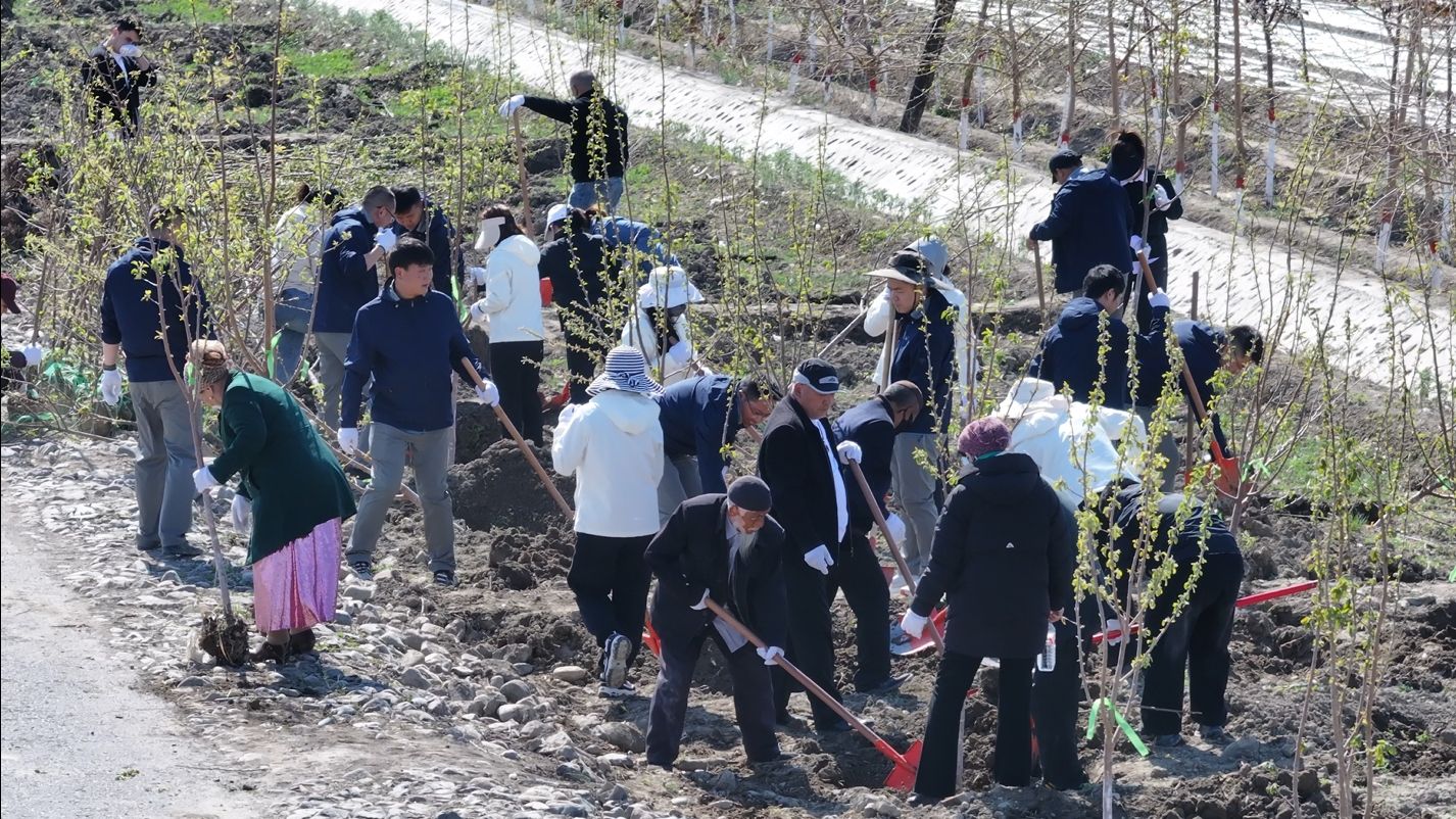 4月20日谷雨至,作物新种,万物生长。在新疆博乐市达勒特镇查干苏木村,武汉援疆工作队25名队员、查干苏木村的村民,以及抗美援朝老战士韩振祥及家人、社区干事齐聚于此,共同开展以“我家新疆有棵树——海棠结同心·鄂博一家亲”为主题的植树活动,用实际行动为新疆大地增添新绿。
