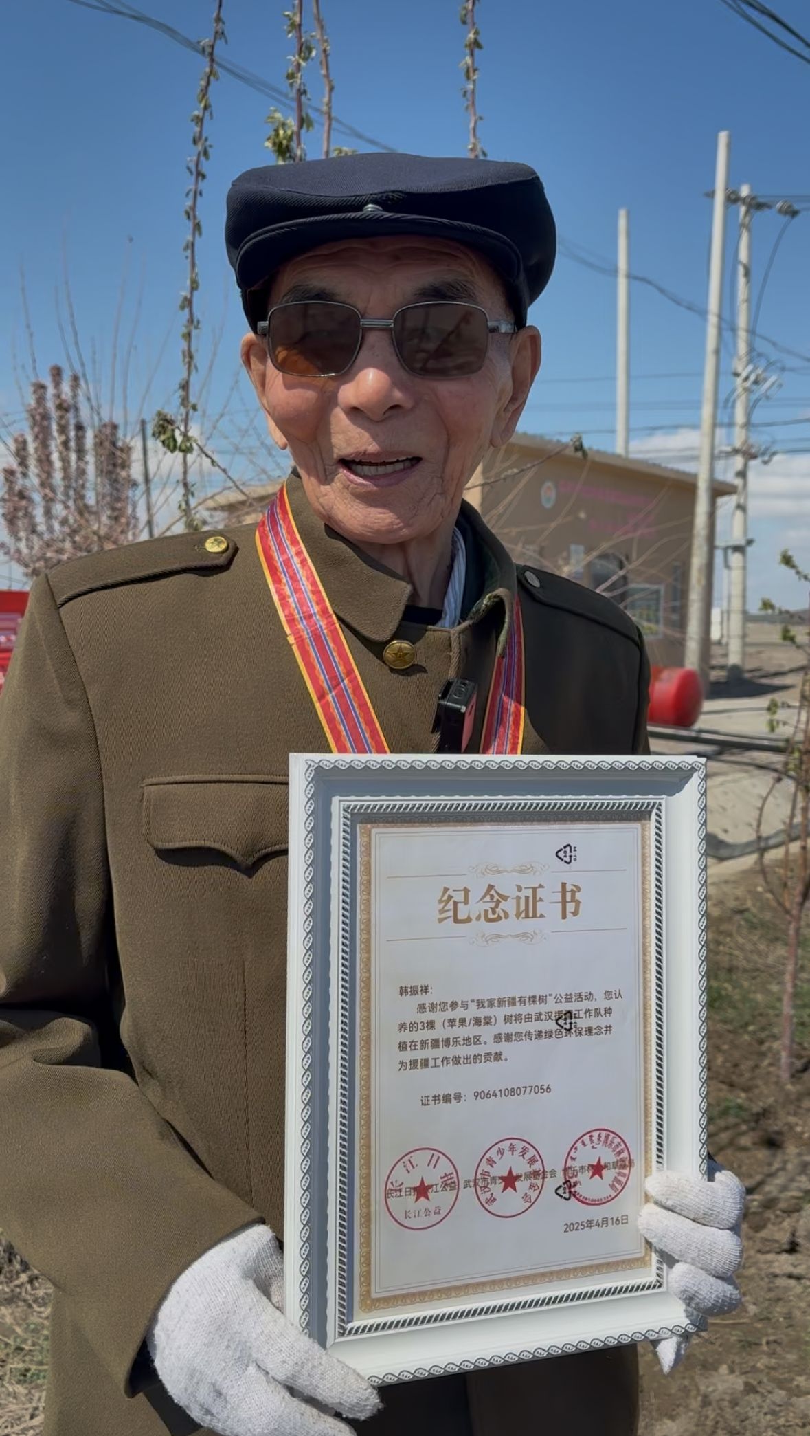 93岁抗美援朝老兵韩振祥拿到“我家新疆有棵树”纪念证书。