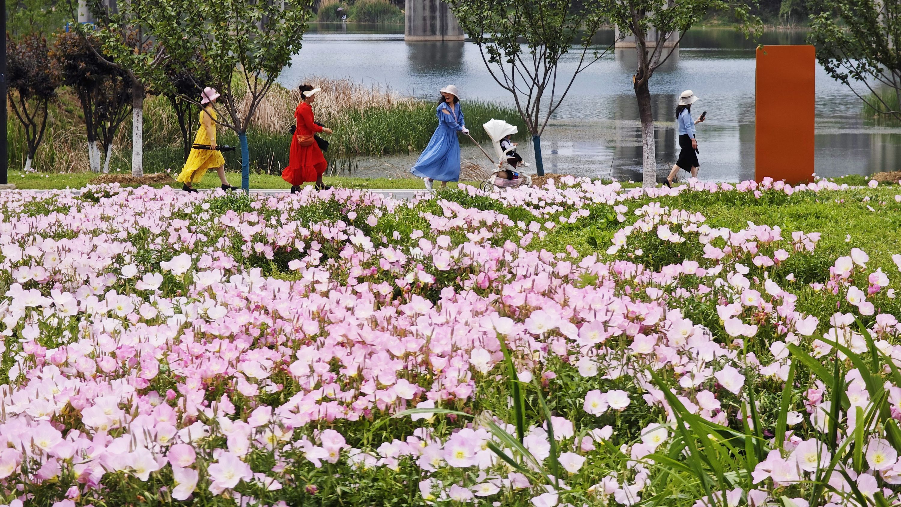 黄塘湖公园里,湖畔种植的月见草花开正旺,游客仿佛置身一片粉色海洋中。长江日报记者詹松 摄