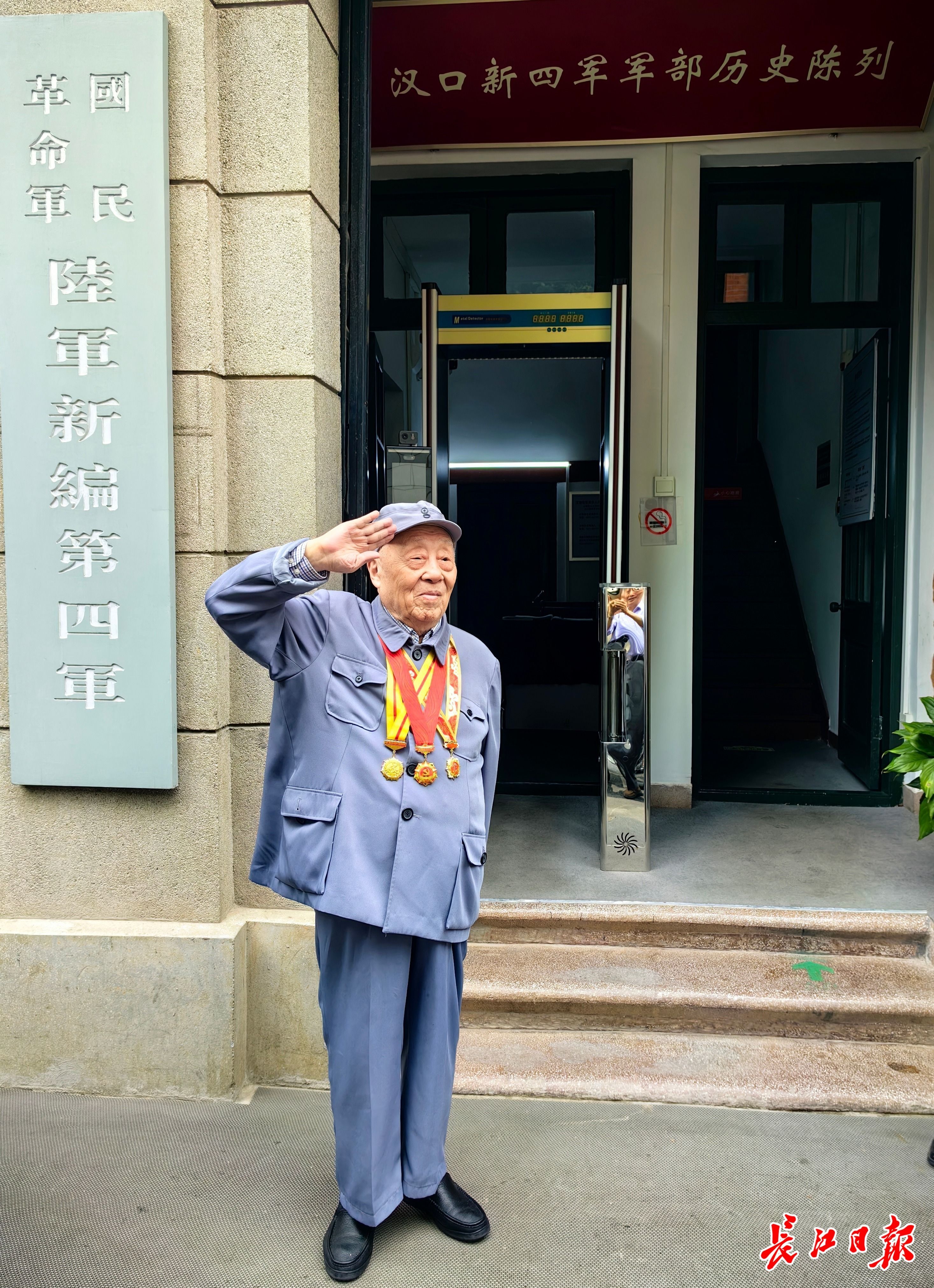 22日上午,百岁新四军老战士丁位西在汉口新四军军部旧址纪念馆前留影。长江日报记者孙笑天 摄