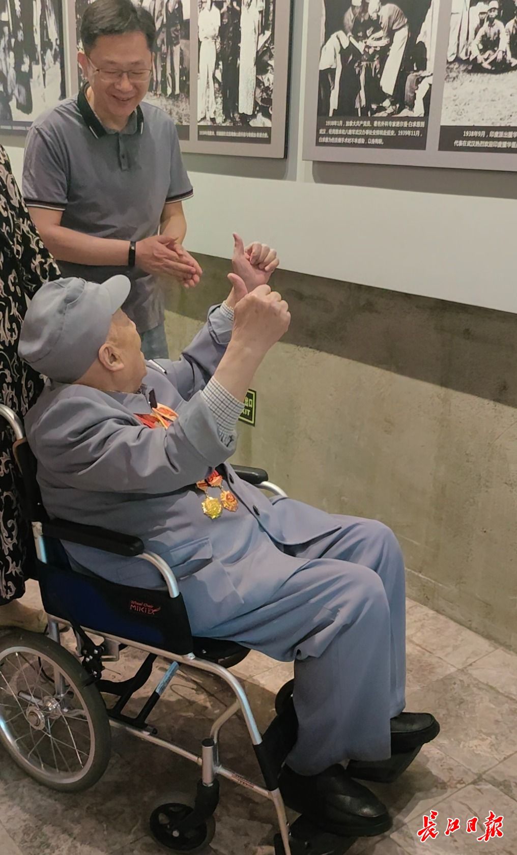 22日上午,百岁新四军老战士丁位西在八路军武汉办事处旧址纪念馆参观时,他举起双手点赞。长江日报记者孙笑天 摄