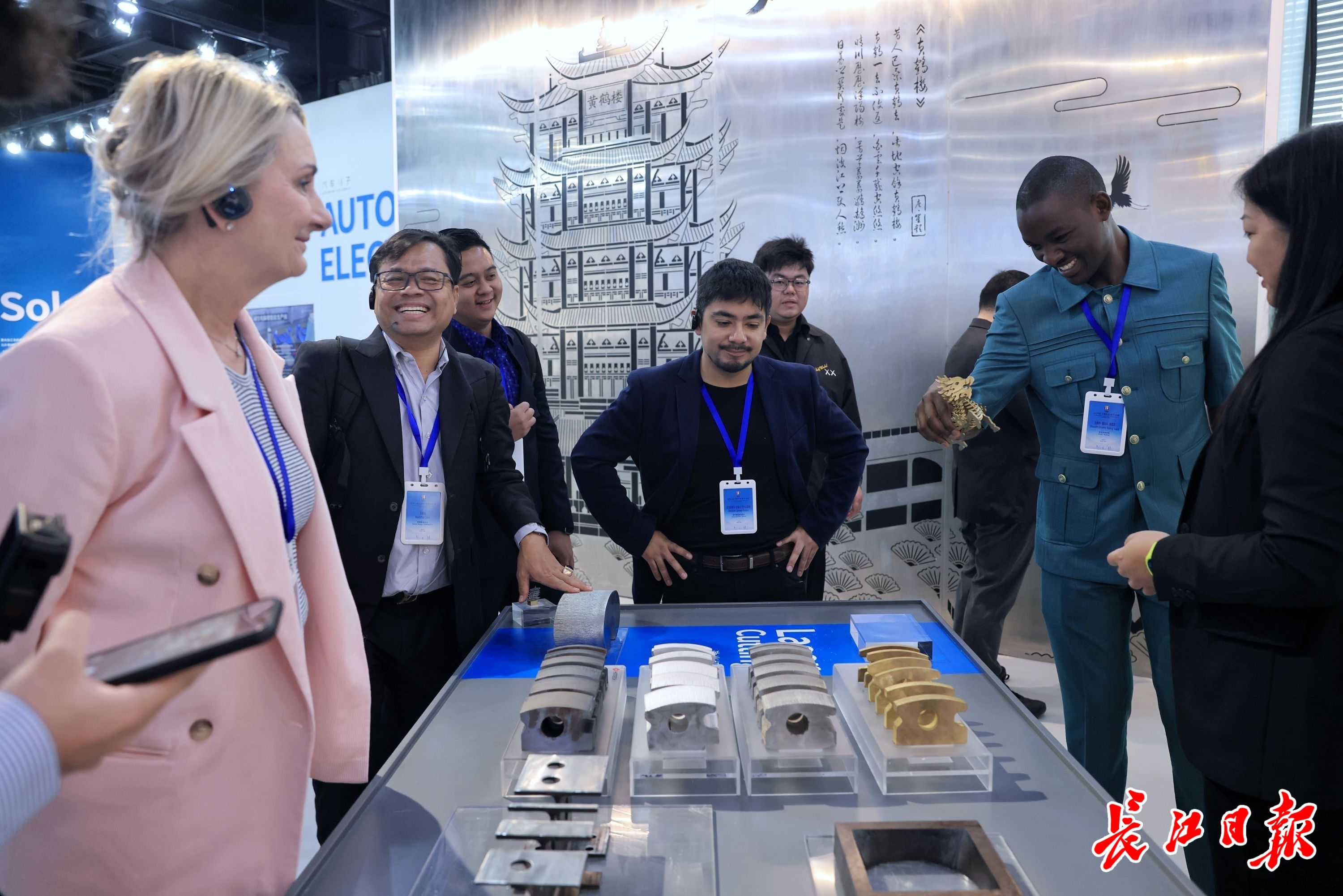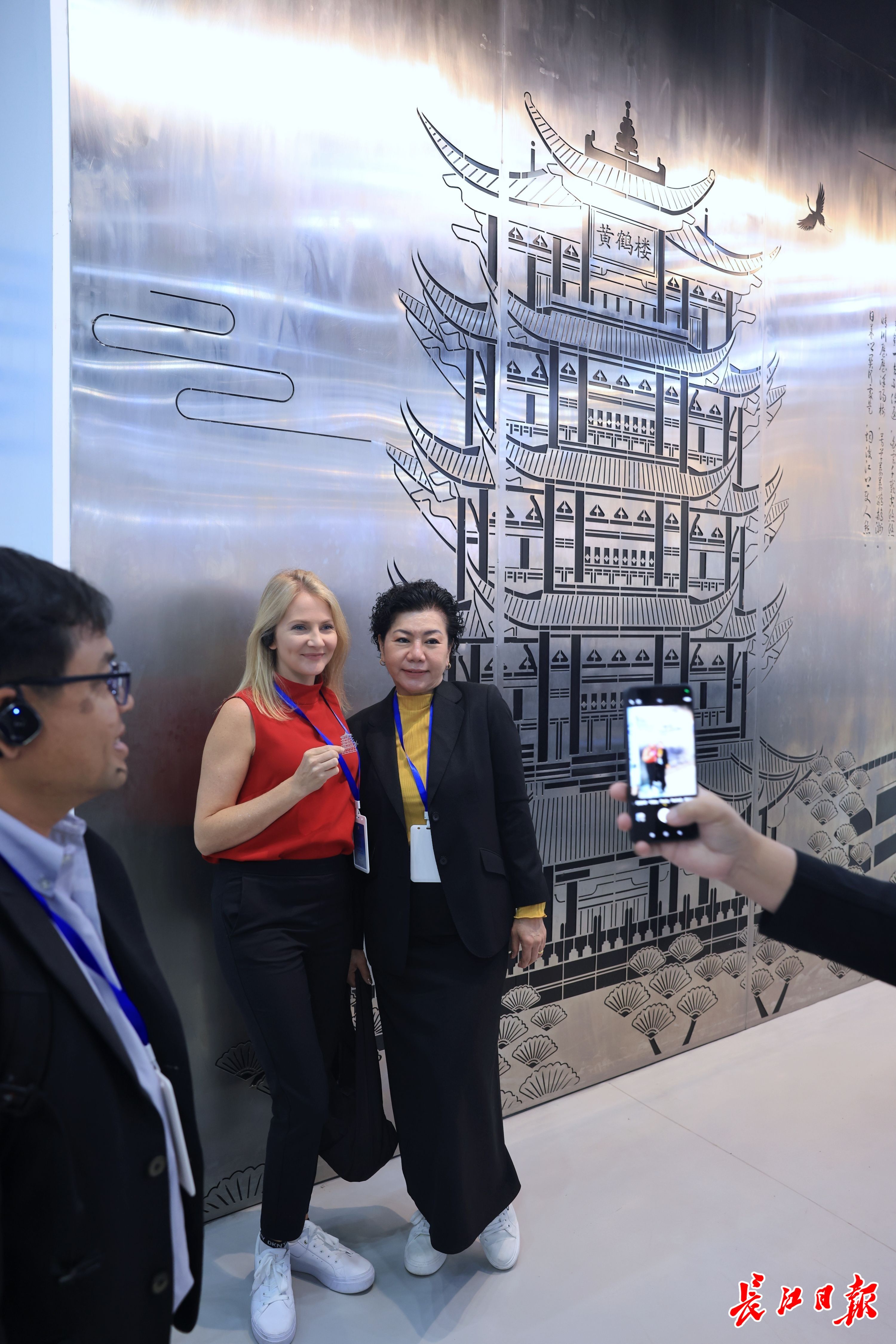 武汉国际友城代表在“黄鹤楼”金属画前合影留念。长江日报记者 胡冬冬 摄