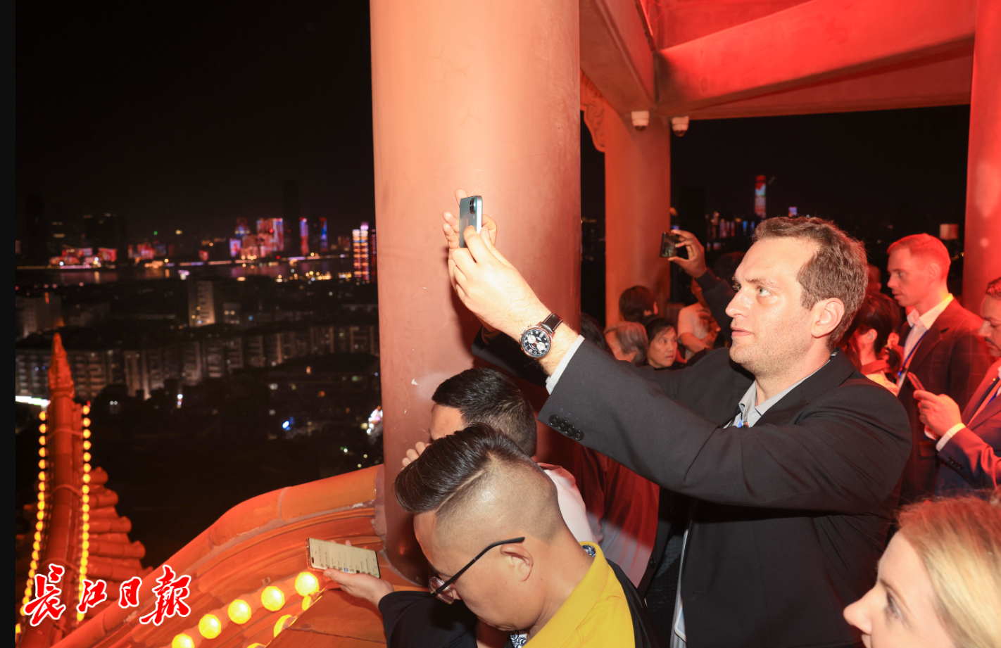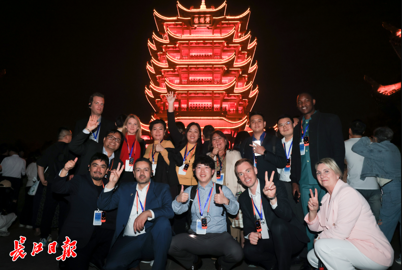 国际友人欣赏《夜上黄鹤楼》灯光秀。
