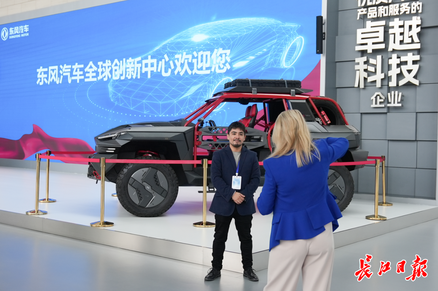 在东风汽车全球创新中心,智利康塞普西翁市国际事务代表克里斯蒂安・拉雷尔・阿尔瓦雷斯站在东风品牌汽车前拍照。