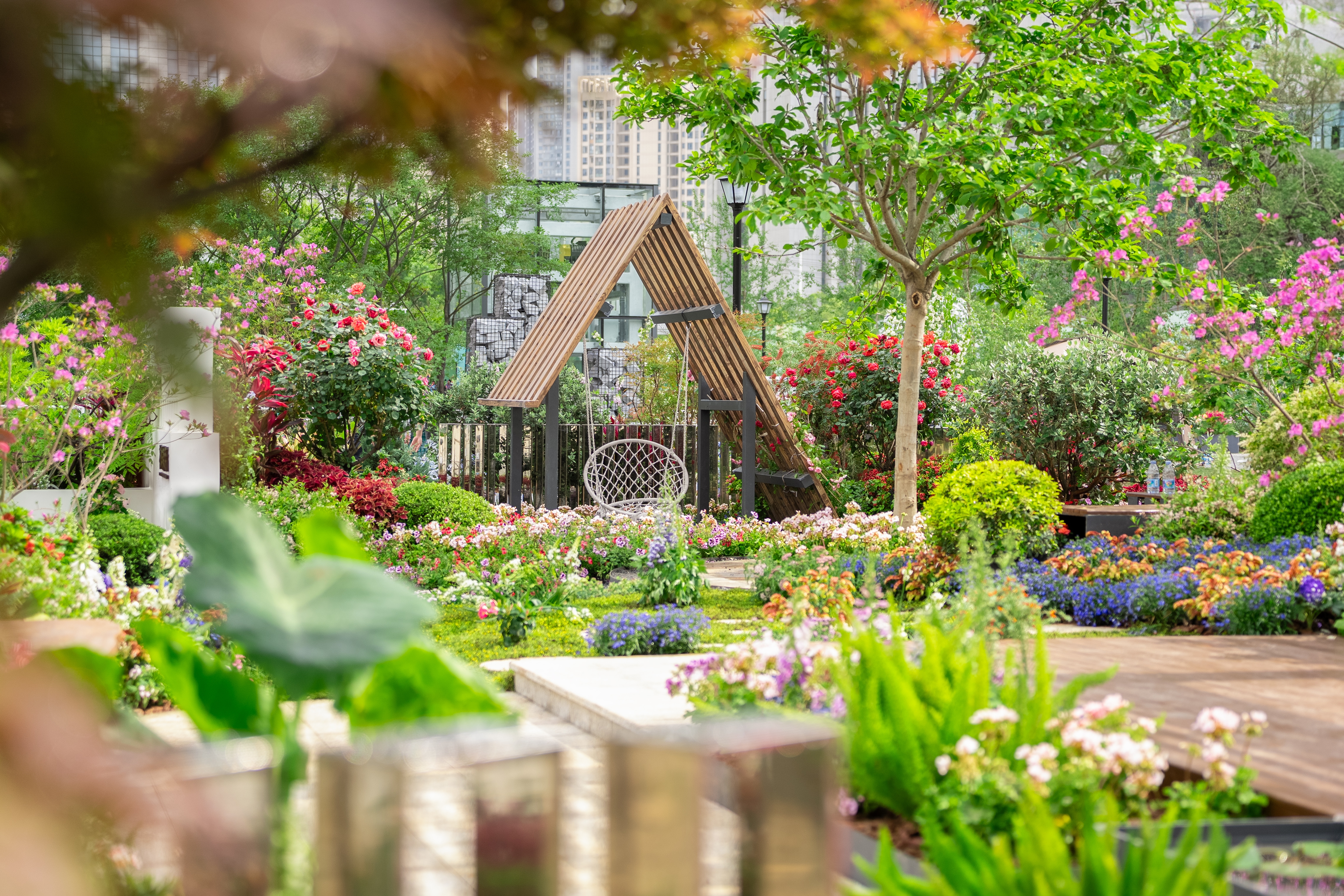 武汉市园林生态集团带来的“花屿生活”花园,将第四代建筑的空中花园具象化,凉亭、秋千屋、水景与60余种花卉,构建出前卫美丽的绿色生活空间。