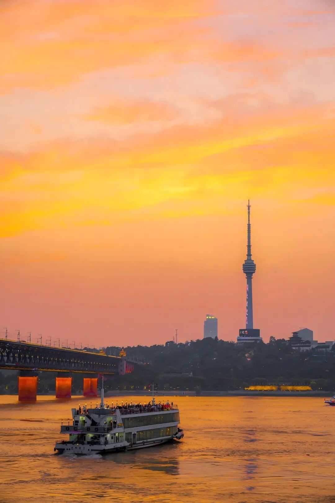 站在桥上,迎面可见绝美落日和龟山电视塔同框,回头看是巍峨的黄鹤楼在金色光芒下熠熠生辉,极目远眺,还能看到宽阔的江面上横跨着武汉长江二桥等桥梁,江水之上,许多船只穿梭,是武汉特有的一景。