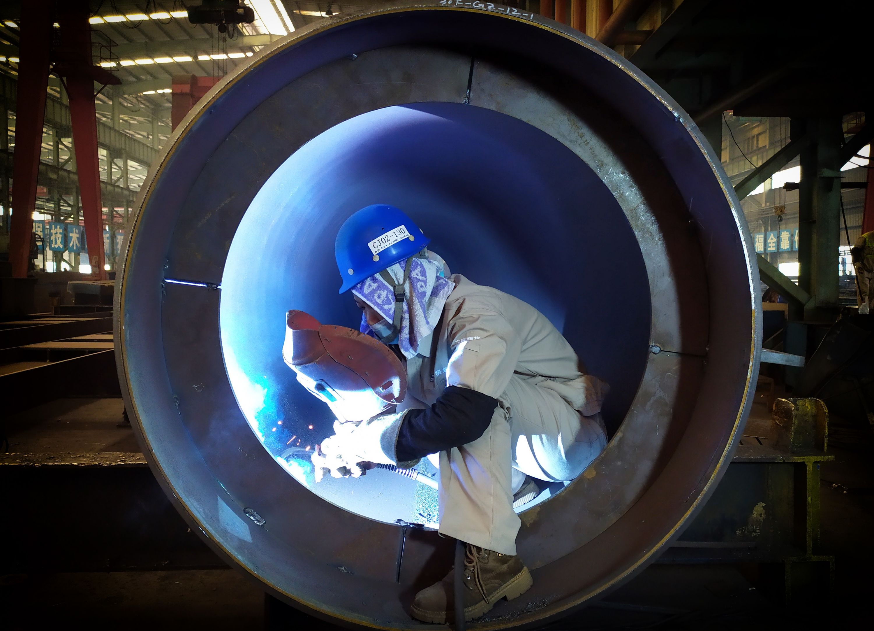 李云飞正在焊接钢构件。中建钢构武汉公司 供图