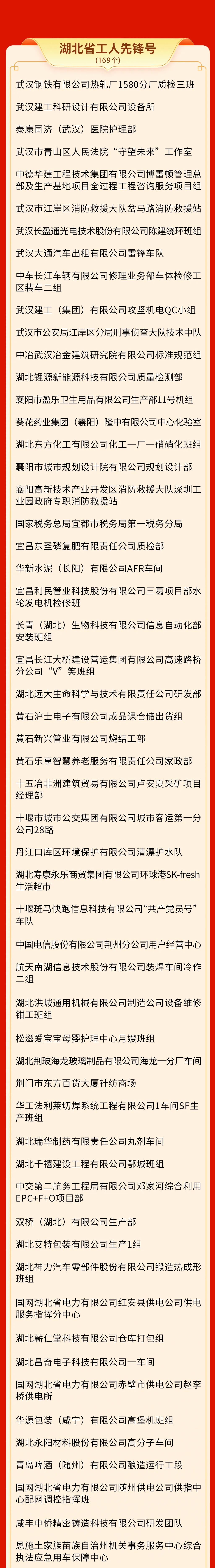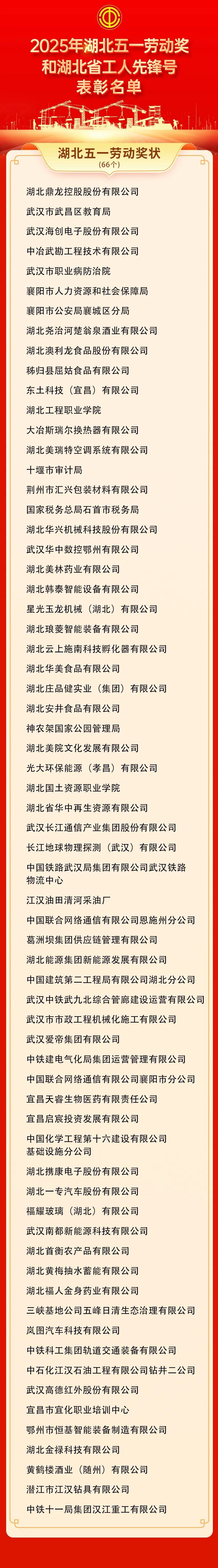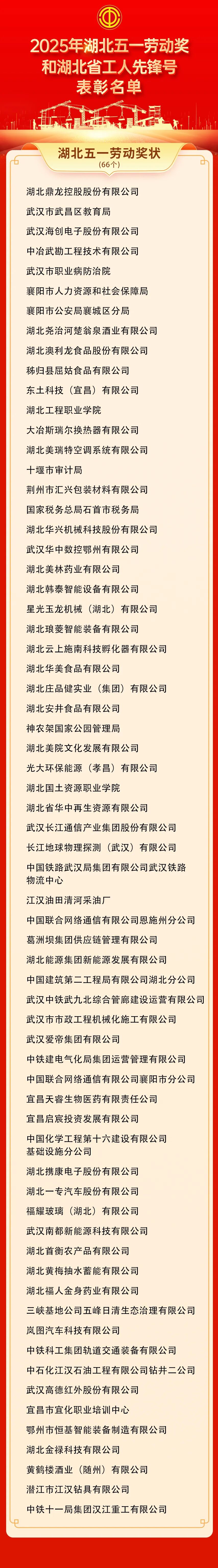 4月29日,湖北省学习贯彻习近平总书记重要讲话精神暨庆祝“五一”国际劳动节座谈会在汉召开。会上宣读了《省人力资源和社会保障厅、省总工会关于表彰2025年湖北五一劳动奖和湖北省工人先锋号的决定》,湖北鼎龙控股股份有限公司等66个单位荣获“湖北五一劳动奖状”,张宝剑等218名个人荣获“湖北五一劳动奖章”,武汉钢铁有限公司热轧厂1580分厂质检三班等169个集体荣获“湖北省工人先锋号”。