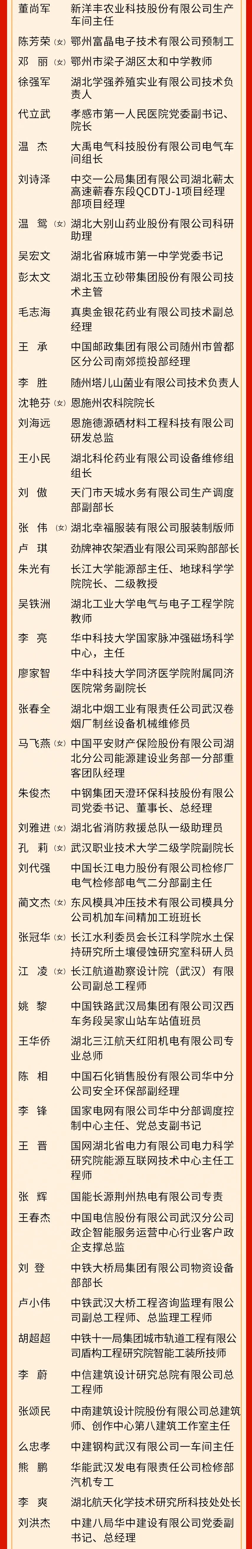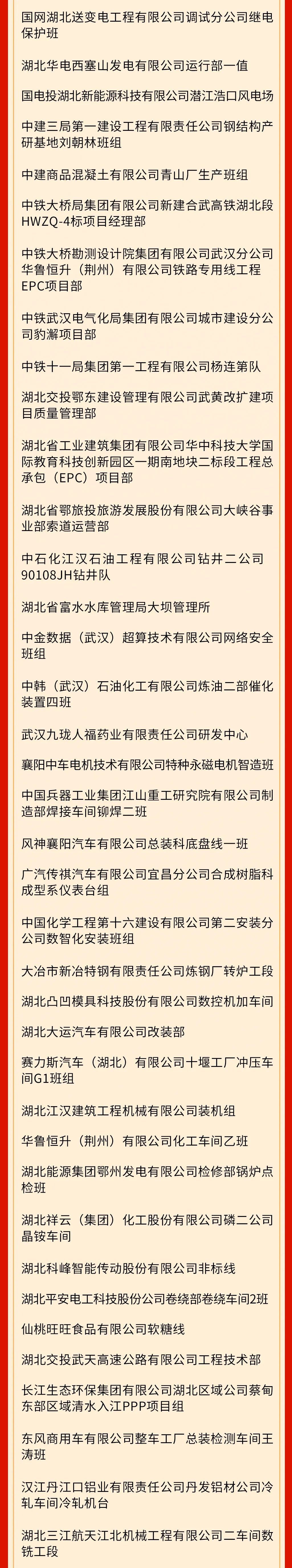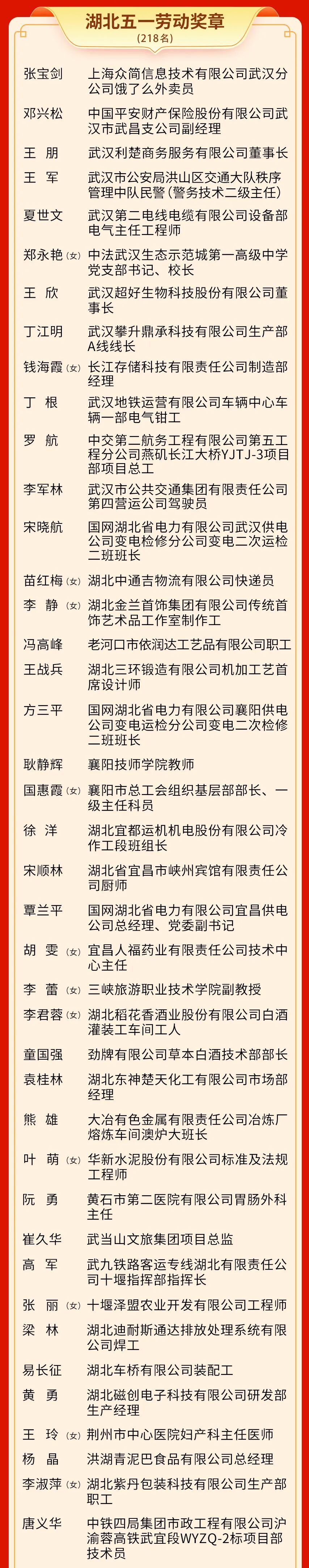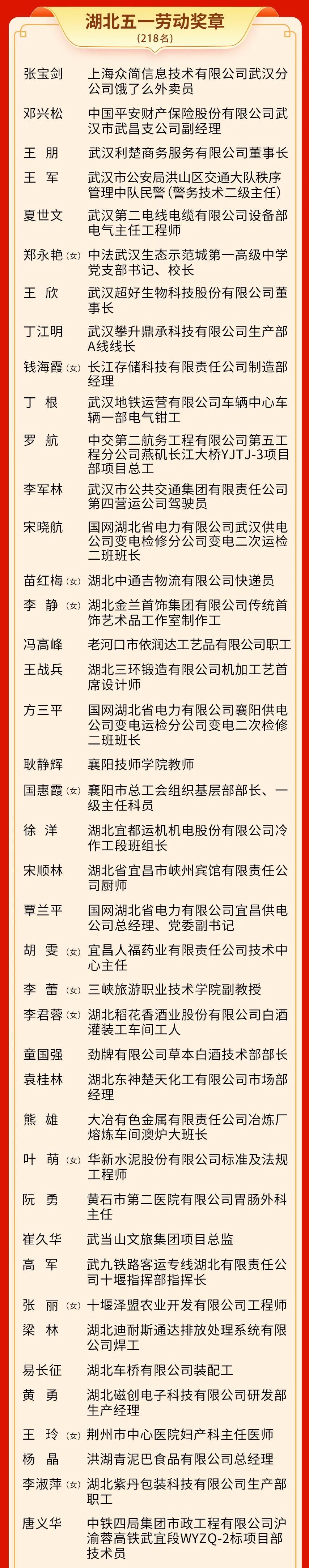 4月29日,湖北省学习贯彻习近平总书记重要讲话精神暨庆祝“五一”国际劳动节座谈会在汉召开。会上宣读了《省人力资源和社会保障厅、省总工会关于表彰2025年湖北五一劳动奖和湖北省工人先锋号的决定》,湖北鼎龙控股股份有限公司等66个单位荣获“湖北五一劳动奖状”,张宝剑等218名个人荣获“湖北五一劳动奖章”,武汉钢铁有限公司热轧厂1580分厂质检三班等169个集体荣获“湖北省工人先锋号”。