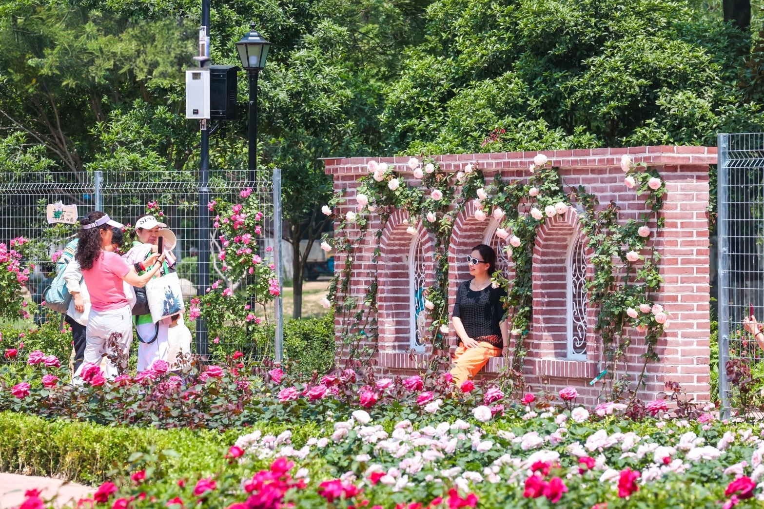 29日上午,长江日报记者在解放公园分会场看到,改造一新的月季园正在举办月季花展。从嘉卉广场至月季园的梧桐道,路面绘上了本届武汉世界花园大会的标识和花朵。在月季园门口内外,分别设置了月季花瀑、树木月季花艺包装打卡点。