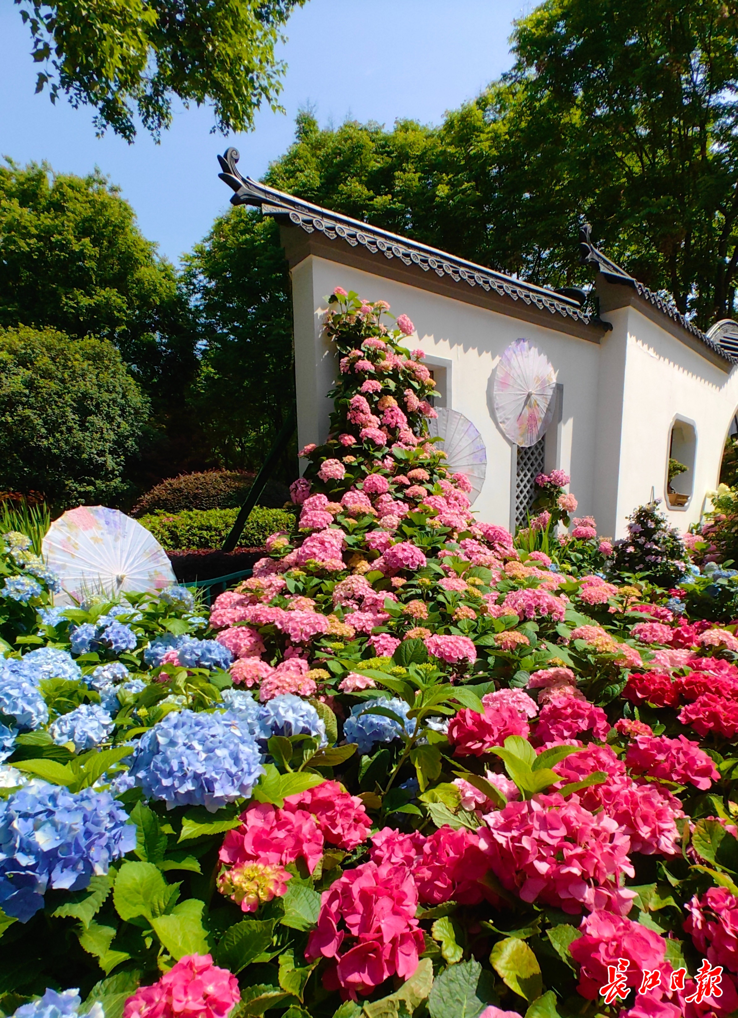 中山公园茹冰景墙展点的绣球花瀑。长江日报记者明眺生 摄
