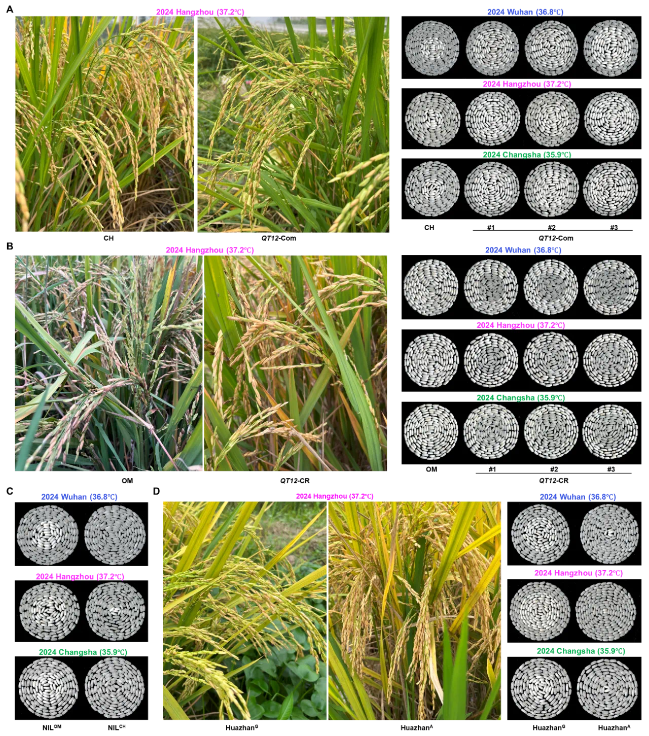 团队将QT12基因导入多个品种的水稻,于2023和2024年的夏季,在武汉、杭州和长沙等长江流域进行大规模田间试验。结果表明,在平均气温37℃的情况下,与野生型水稻相比,QT12基因突变株系新品种产量分别提升92.5%、64.1%和54.7%,且外观品质晶莹剔透、米饭食味性好,验证了其在高温环境下优质、高产、抗高温的综合育种实力。