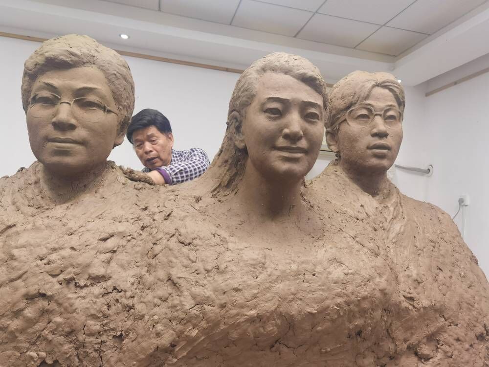 雕塑家陈德新调整雕像下巴轮廓。记者胡冬冬 摄