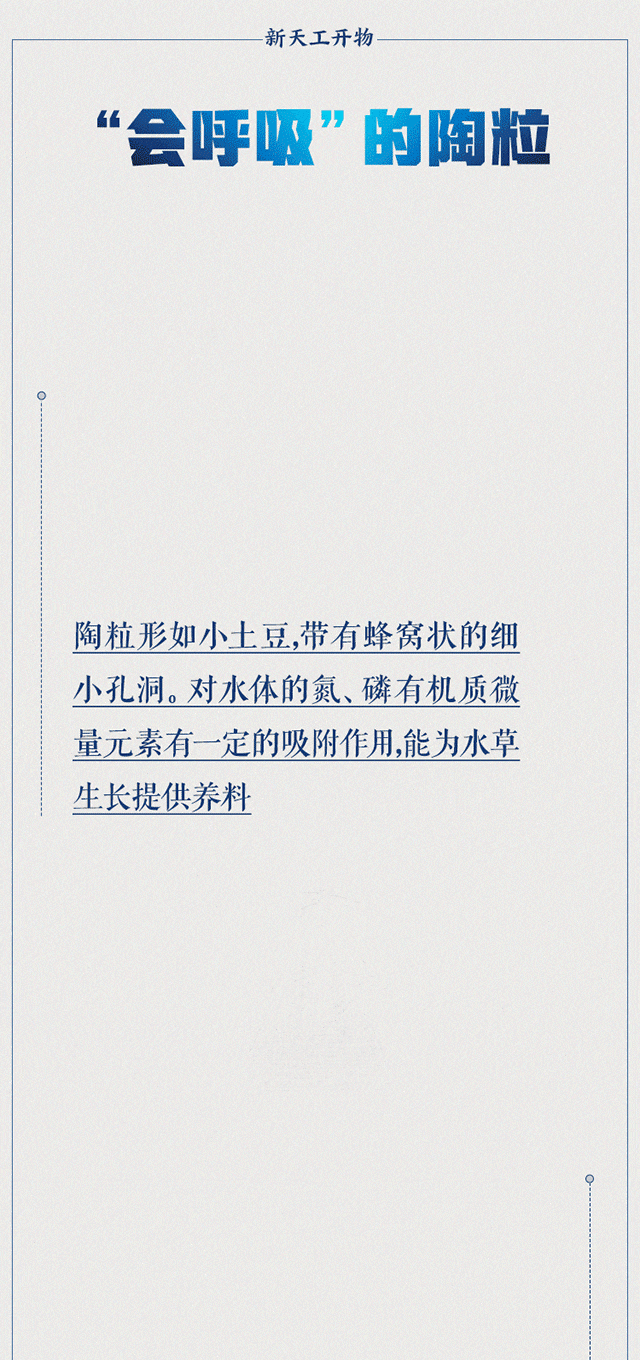 这种陶粒,具有很强的亲水性,内部是细密的蜂窝状多孔结构,密度小、重量轻。这些特性使得它们如同一粒粒“魔法石”:它们有“臂膀”,一些沉水植物依附它们而生长,又通过光合作用大幅提升水体中的溶解氧含量。