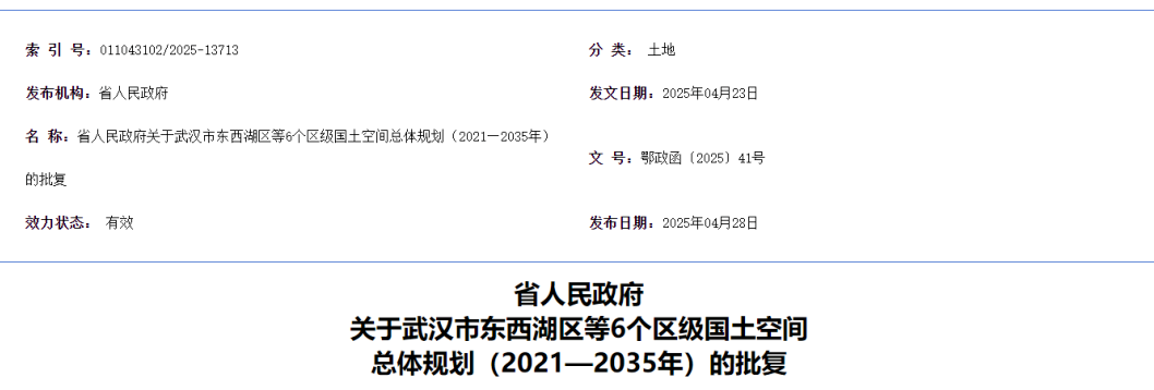 点击查看《省人民政府关于武汉市东西湖区等6个区级国土空间总体规划(2021—2035年)的批复》