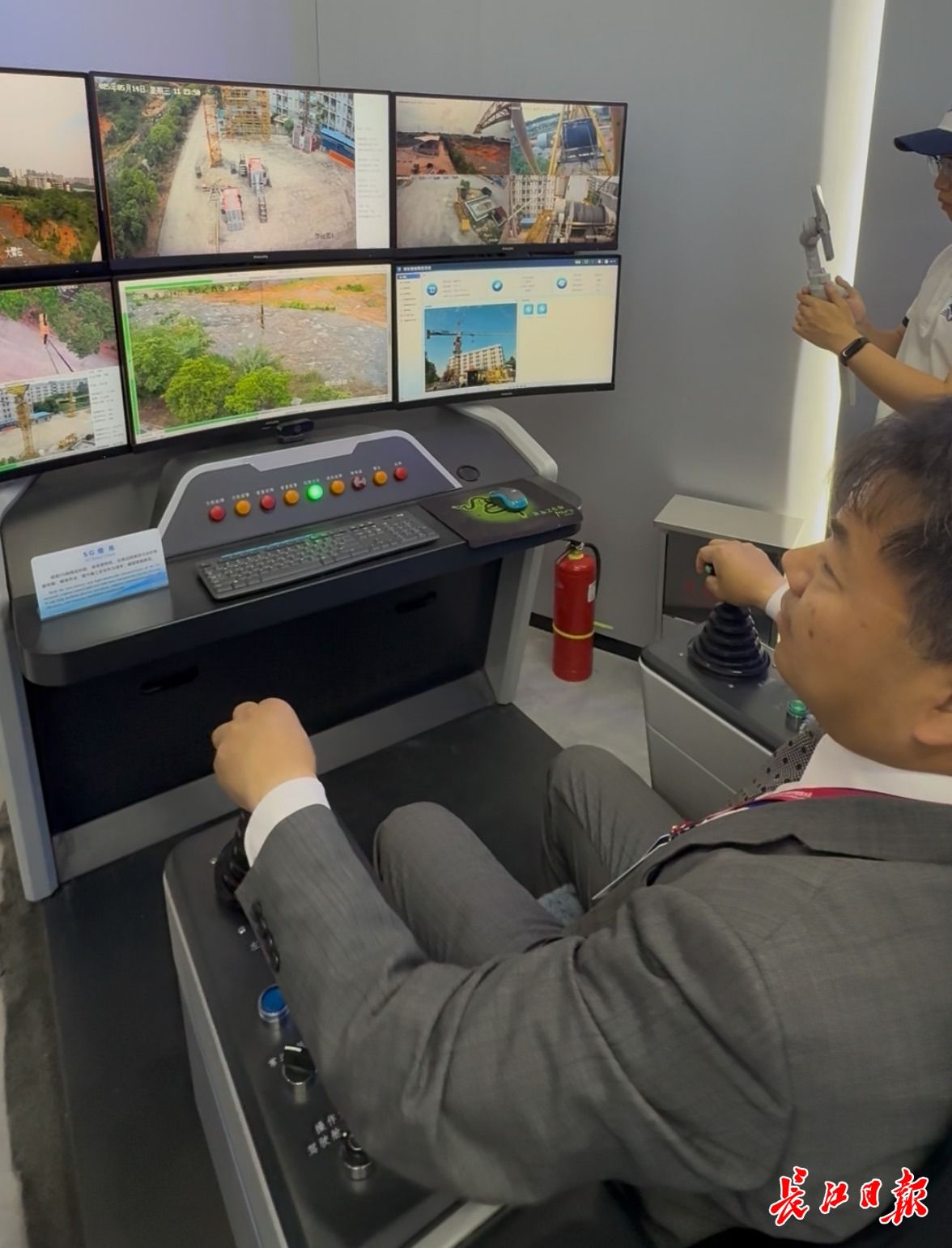 日本福冈大学教授万军民体验5G塔吊技术。记者陈晓彤 摄