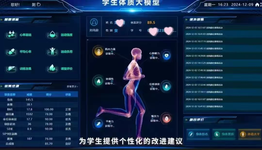 “多模态”体育数据模型由体质健康监测、体育课锻炼、课间活动、AI微站、总体画像五大板块构成。学生在体育课上佩戴智能手环运动、在体育AI微站前主动运动、在课间走到室外运动时长……这些数据,都能被采集、留存、分析,由此构建了每个学生的体育数据库,将数据整合成了学生运动健康画像,不仅能科学分析学生的运动素质、运动习惯、运动喜好,还能更好地引导学生走向室外、走向操场、走向阳光、走向运动。