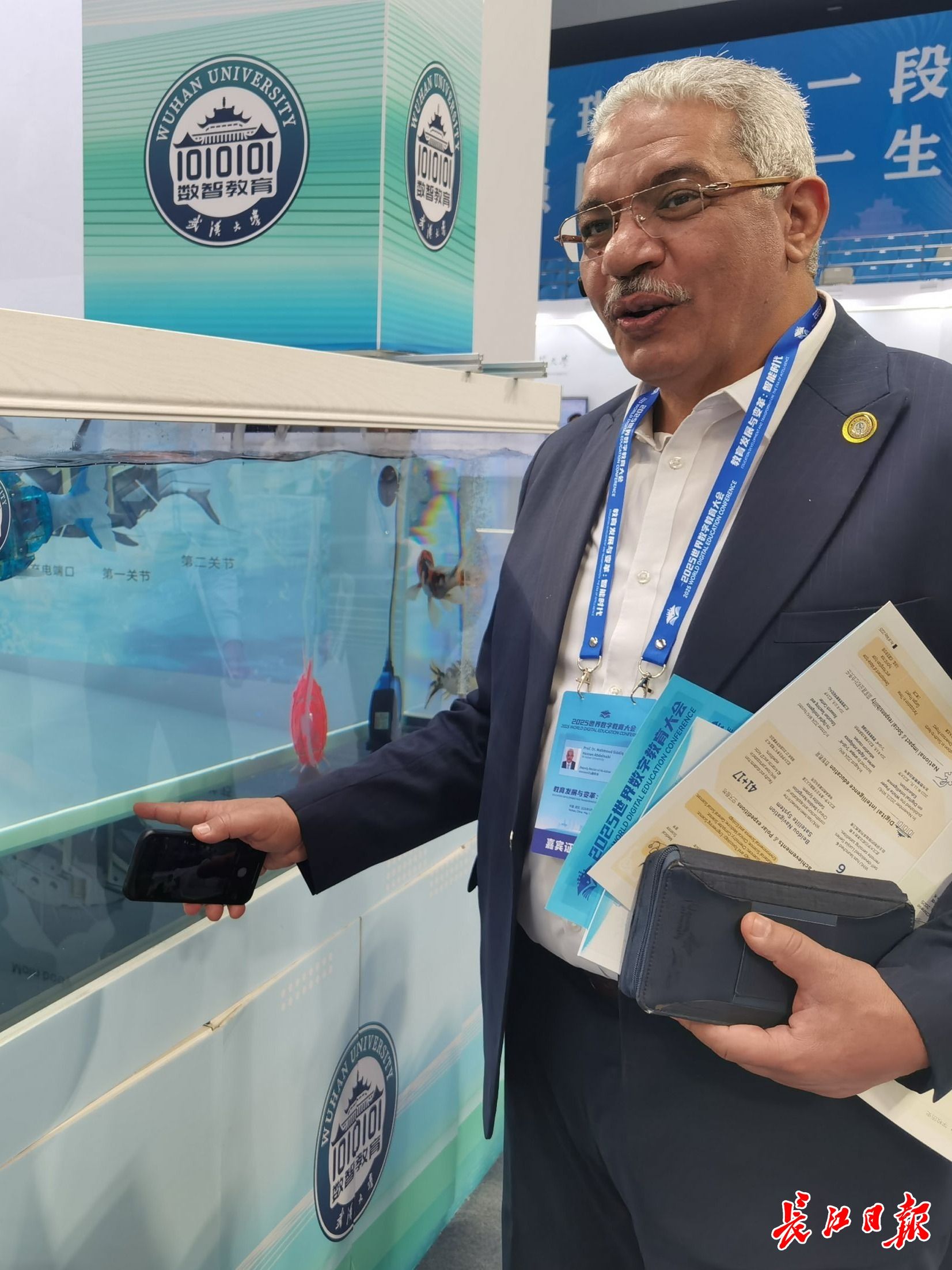 詹姆斯·克雷布院士围着“天问”转了又转,他还拿出手机录下视频。法国洛林大学戴维教授则盯着鱼缸里游动的几条仿生机器鱼思绪良久,还站在鱼缸旁跟仿生机器鱼合影。