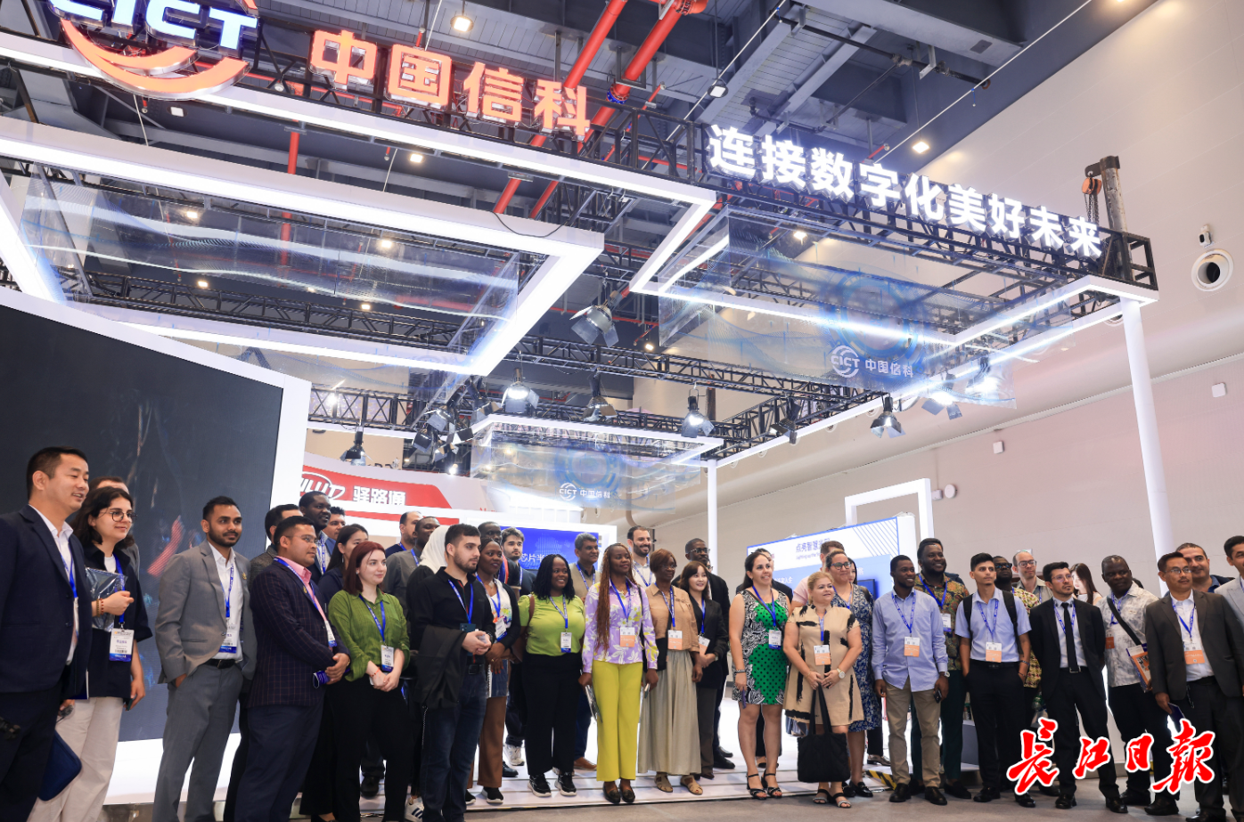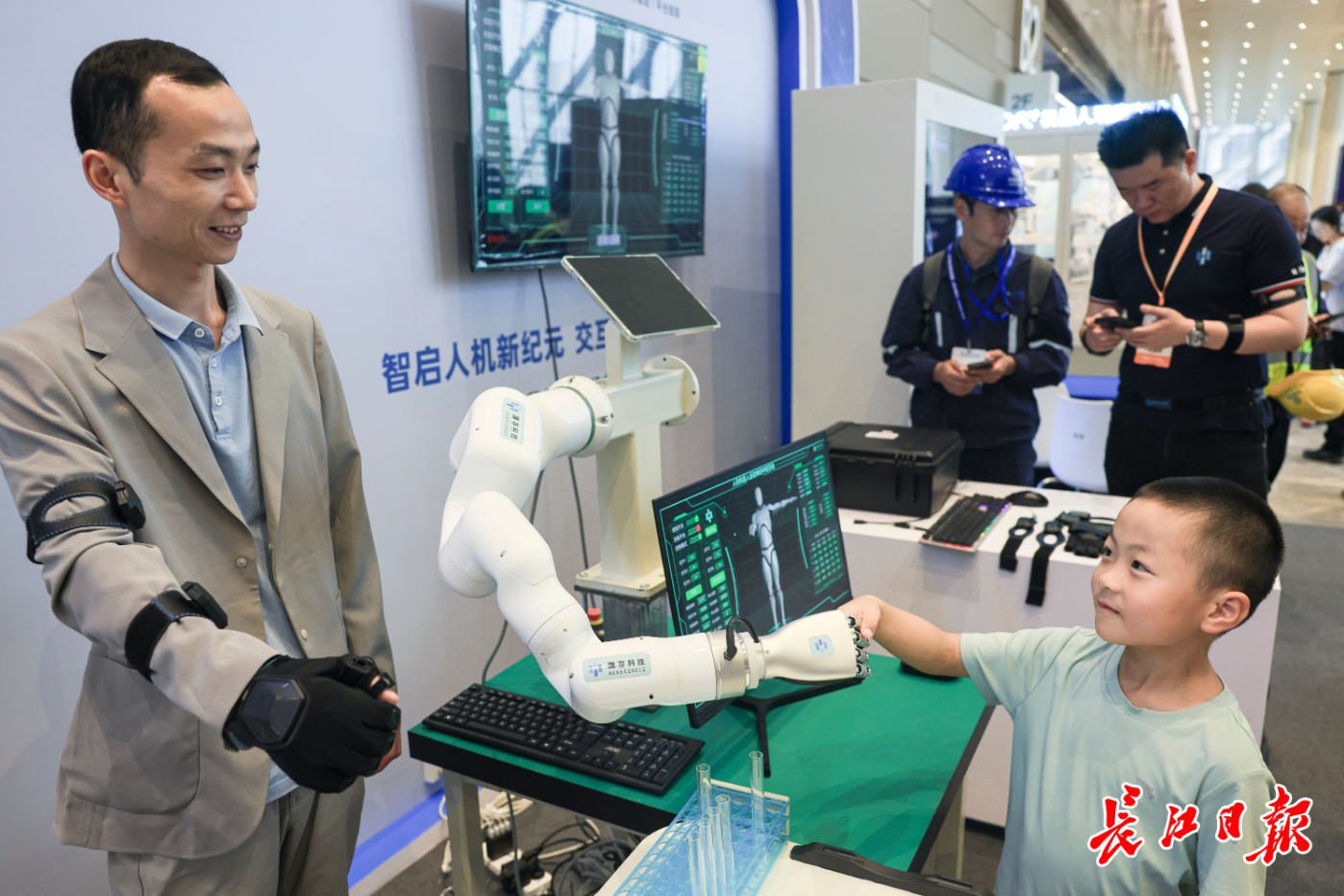 “光+机器人”展位,武汉灏存科技工程师付龙演示人形机器人运动神经中枢系统,通过穿戴设备操控机械臂灵巧手和小朋友 握手。