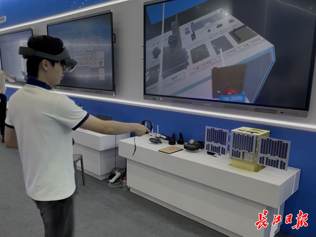 在武汉大学卫星仿真系统展台,遥感信息工程学院大四学生陈映午戴上VR眼镜,操纵手柄,展示着“启明星一号”从安装到发射全过程。