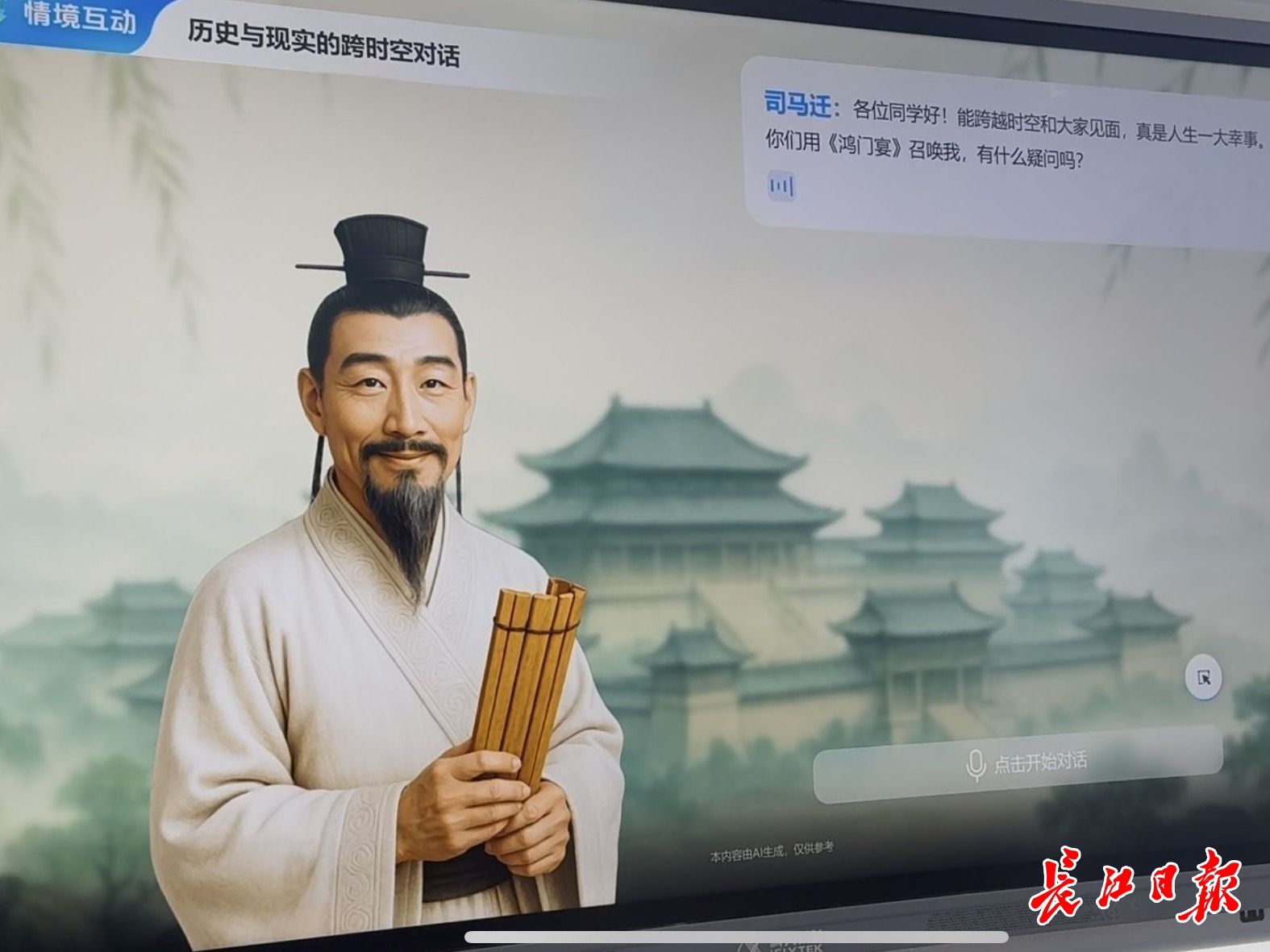 在科大讯飞展台,司马迁竟然“开口说话”了。在AI黑板上,工作人员打开课文《鸿门宴》,点击“虚拟人智能体”,课本上的司马迁形象被“复活”:“能跨越时空和大家见面,真是人生一大幸事。你们用《鸿门宴》召唤我,有什么疑问?”