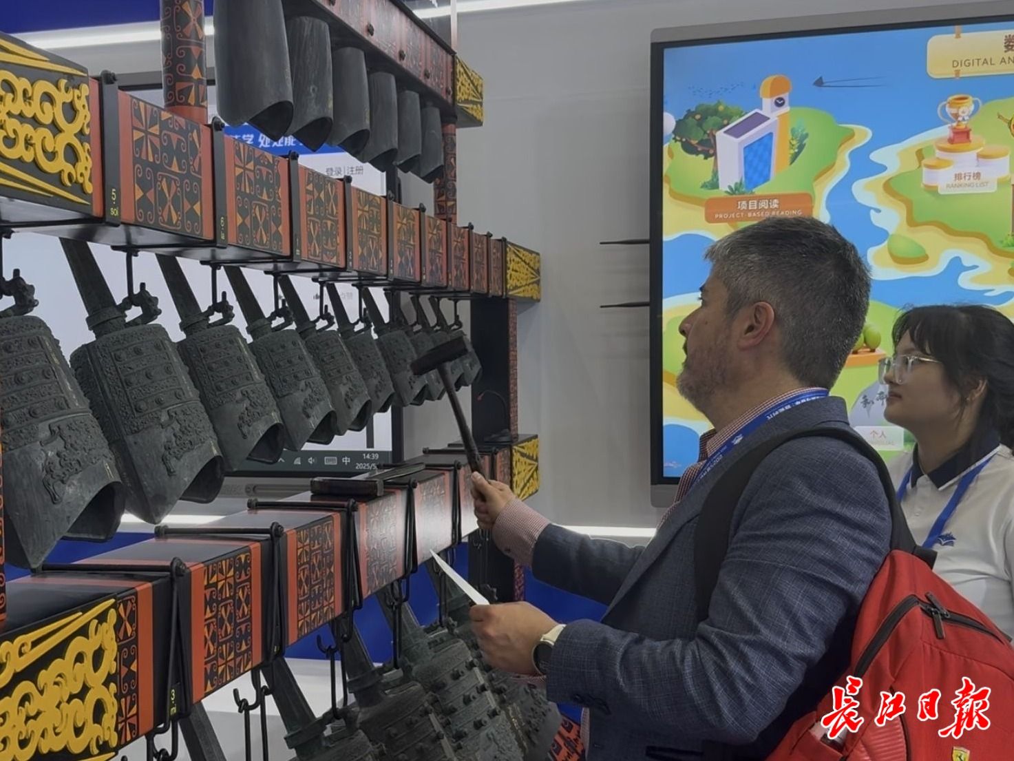 曲毕,武汉市育才小学教学主任孙琳为他递上一张书签,其上画着编钟,还印着一串音频波纹,这段波纹就是敲击编钟转化而来的。如果用手机扫描书签上的二维码,手机屏幕上会出现由学生们设计的编钟吉祥物,一边跳舞一边朗诵诗歌。