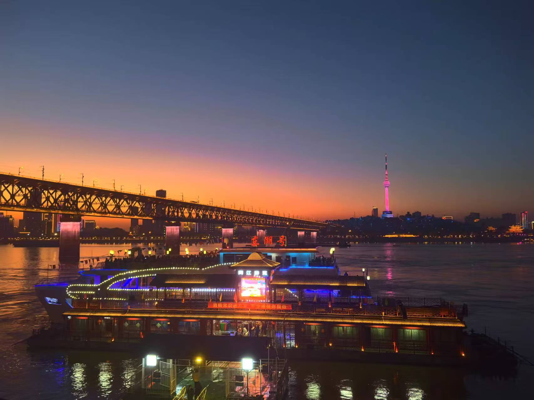 随着初夏来临,汉阳门码头每天晚7时准时起航的落日航班备受青睐。起航时,落日余晖洒在江面上,漫天橙霞,游船仿佛在“橘子海”中畅游;待夕阳西下,天空进入蓝调时刻,两岸高楼灯光亮起,宛如霓虹画卷,将江城的夜装点得如梦似幻。与此同时,粤汉码头的小龙虾自助餐航班,让游客“左手剥虾,右手举杯”;汉阳门码头的沉浸式情景剧“满江红·岳飞”升级版,以长江为幕、游船为台,观众化身“岳家军”,亲历“再续汉阳游,骑黄鹤”的豪情,沉浸式体验长江文化的历史底蕴。