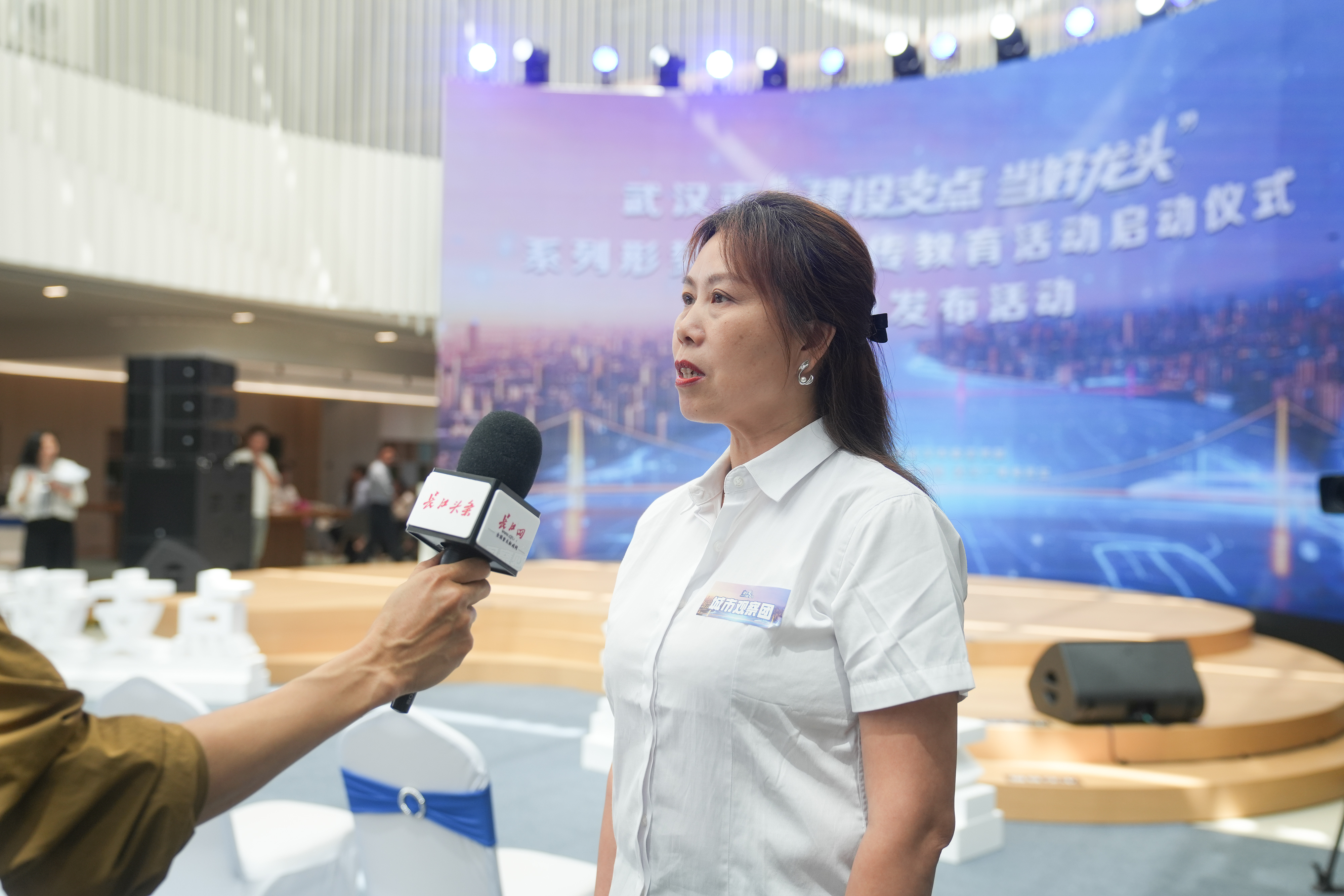 在参加武汉市“建设支点 当好龙头”系列形势政策宣传教育活动启动仪式后,城市观察团成员、武汉卓越会文化传媒中心钱玲接受采访。彭年 摄