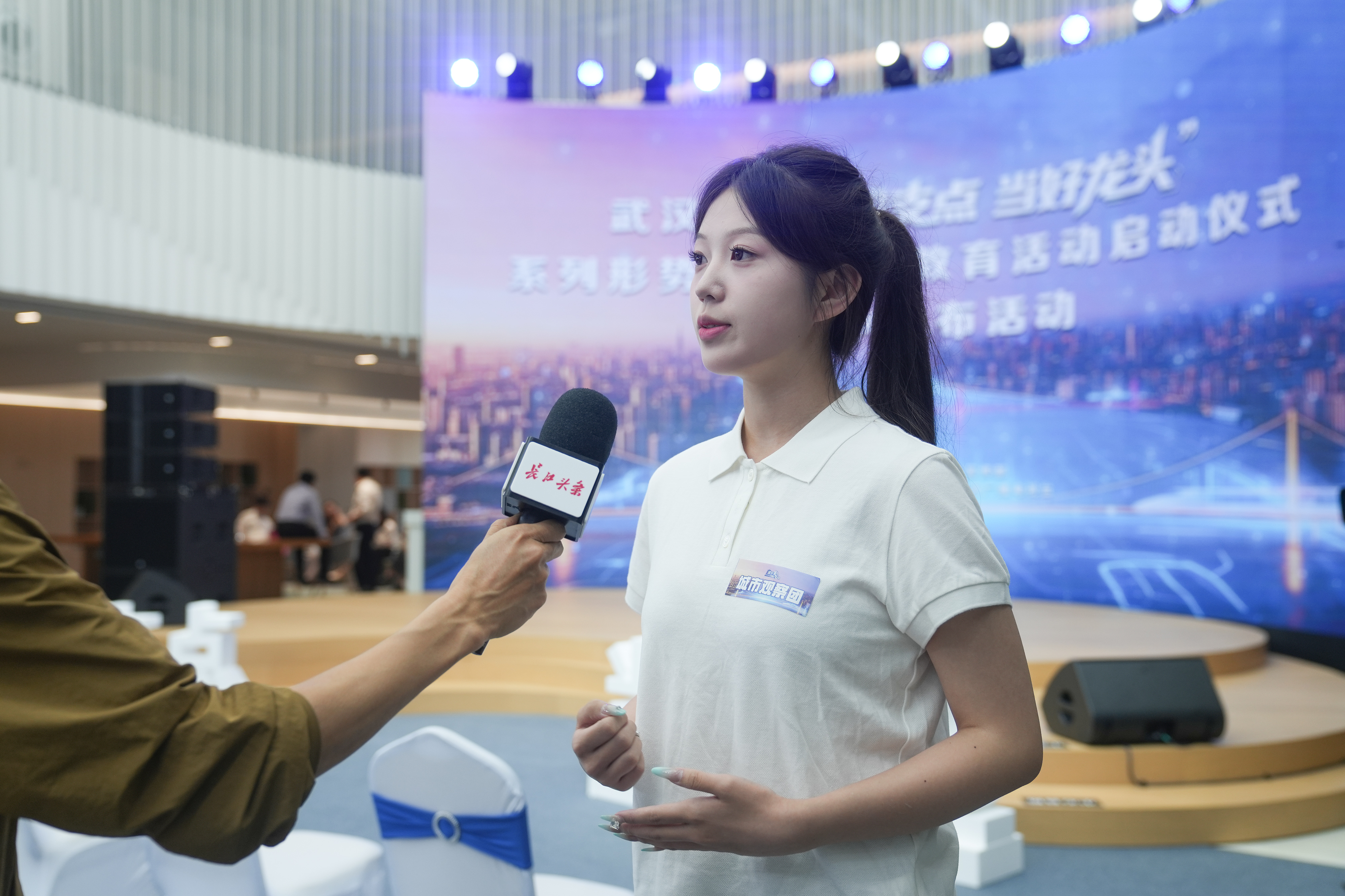 在参加武汉市“建设支点 当好龙头”系列形势政策宣传教育活动启动仪式后,城市观察团成员、武汉理工大学学生魏嘉接受采访。彭年 摄